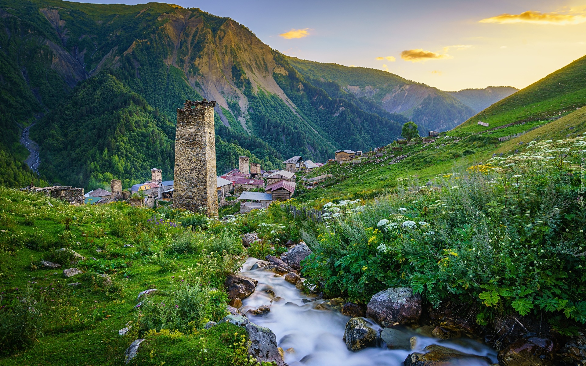 Edytor tapety: Domy i ruina baszty obronnej w gruzińskim Adishi