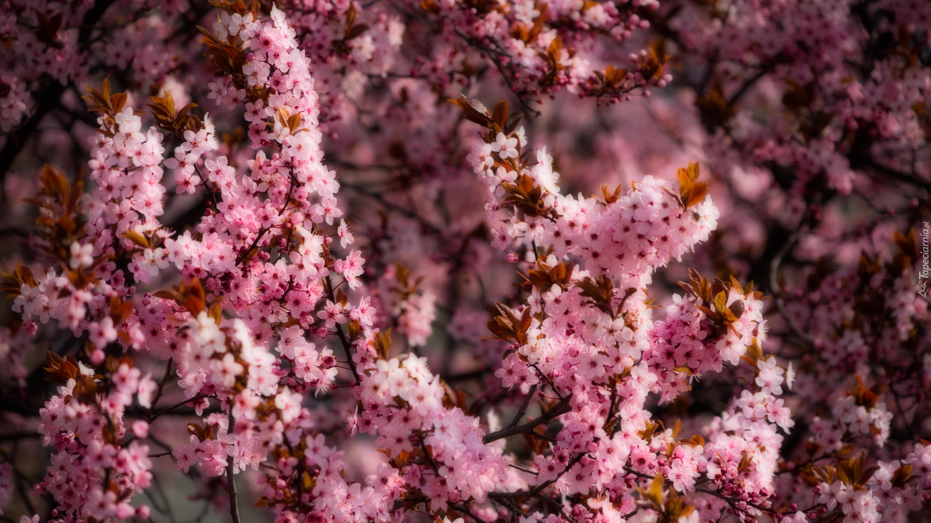 Edytor tapety: Okwiecone różowymi kwiatami drzewo owocowe