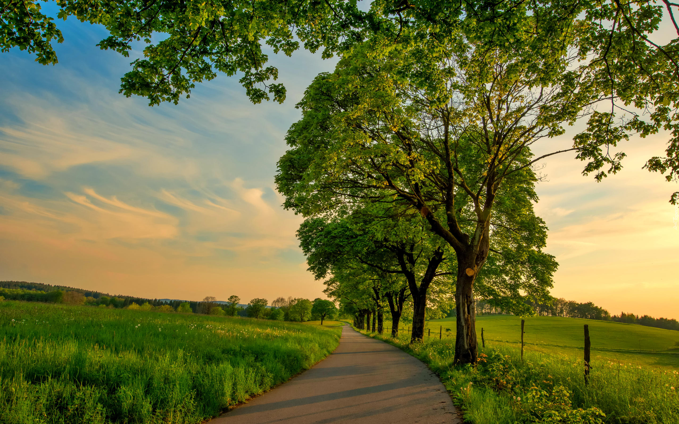 Edytor tapety: Ogrodzona łąka przy szpalerze drzew obok drogi