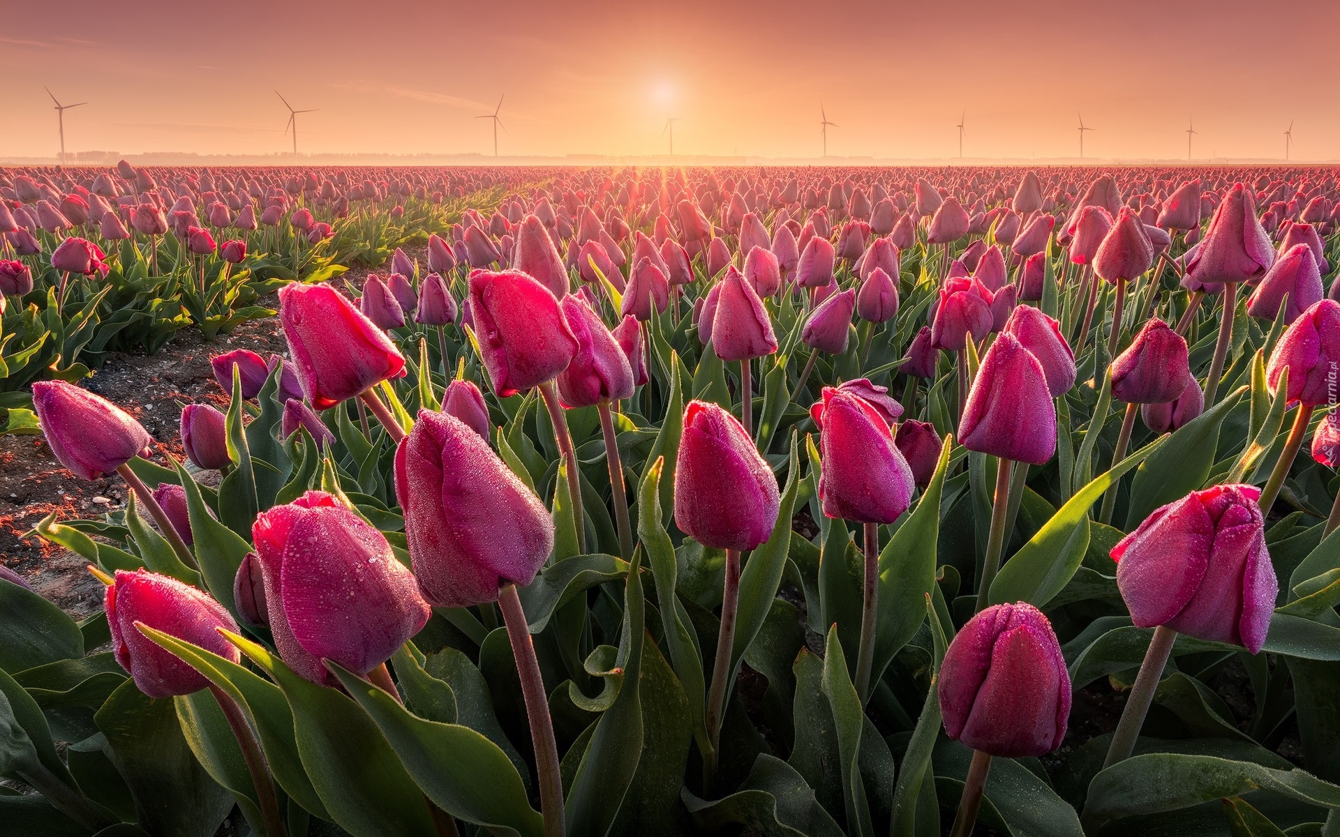 Edytor tapety: Zamglony wschód słońca nad plantacją tulipanów