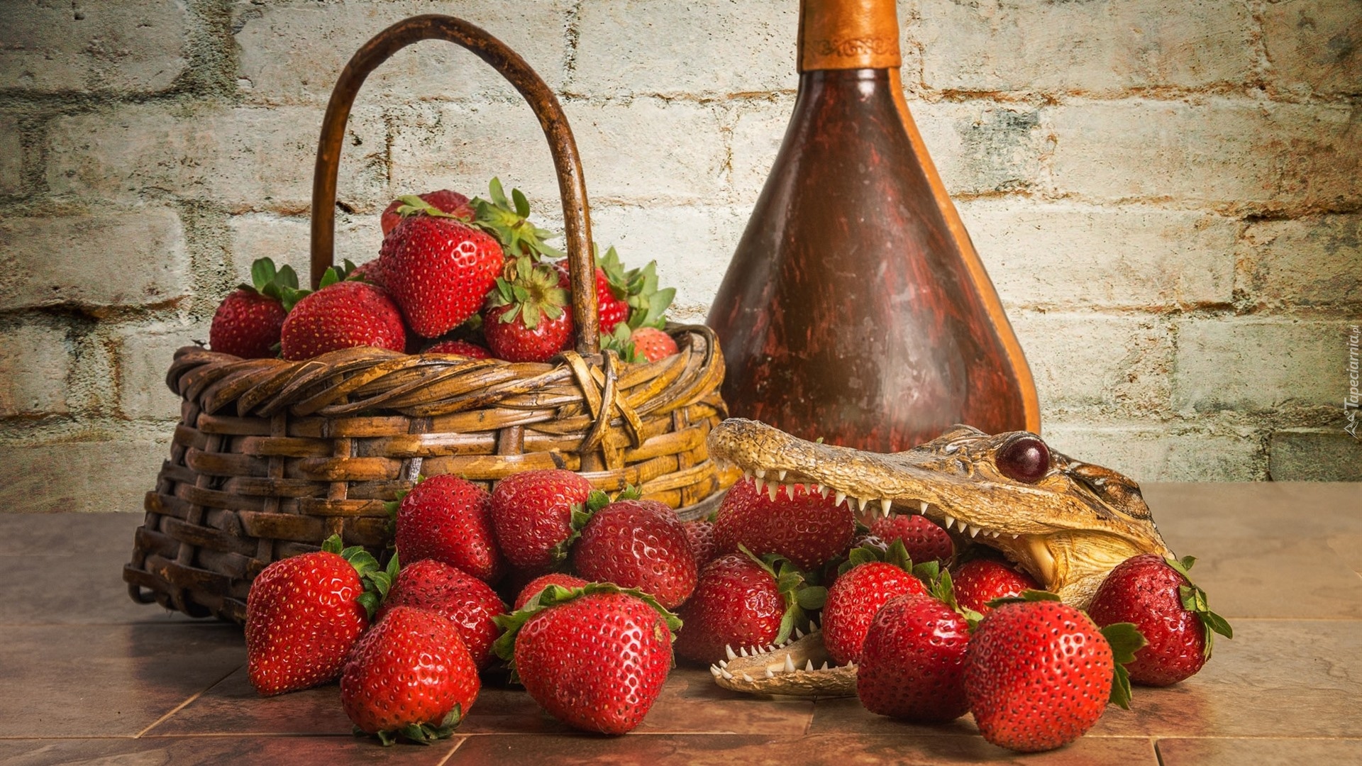 Edytor tapety: Głowa kajmana i butelka obok koszyka truskawek