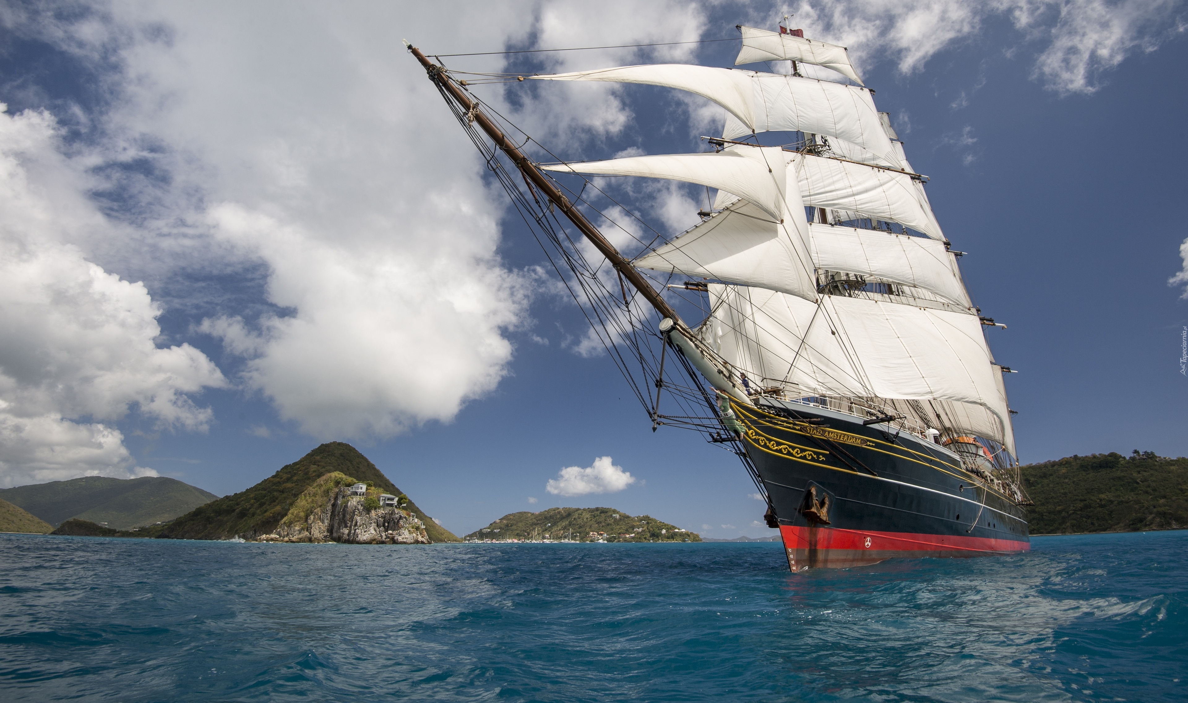 Edytor tapety: Żaglowiec na morzu z widokiem na góry