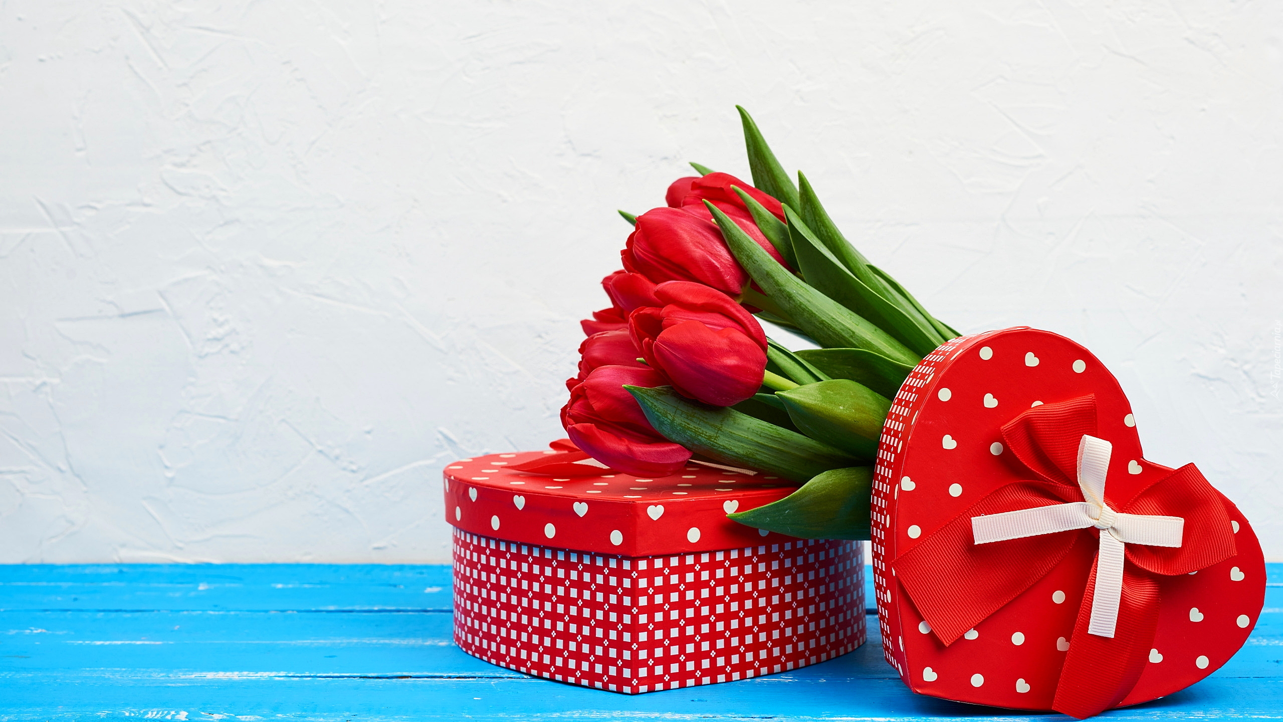 Edytor tapety: Tulipany na pudełku w kształcie serca