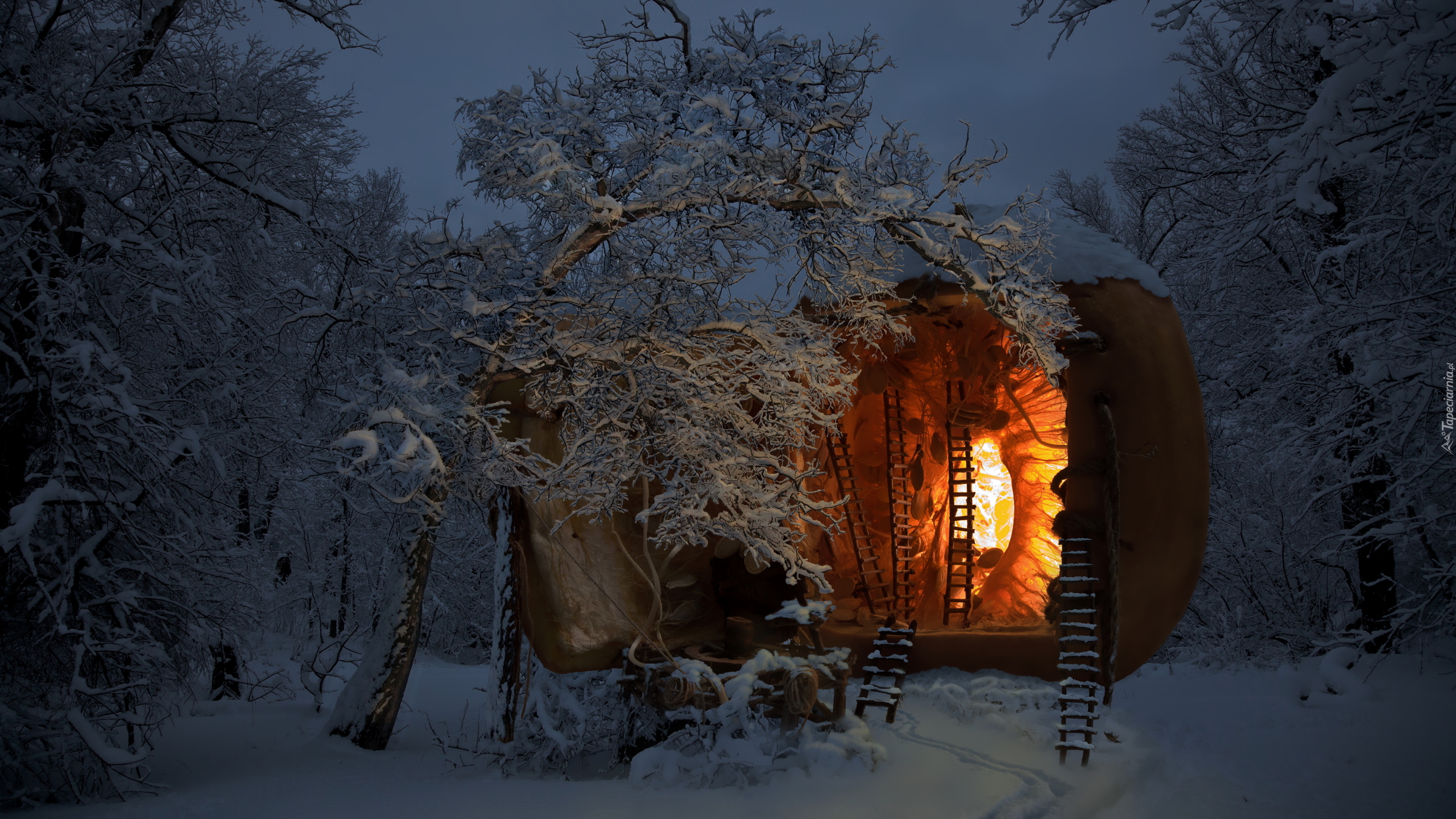 Edytor tapety: Oświetlony domek w zimowym lesie