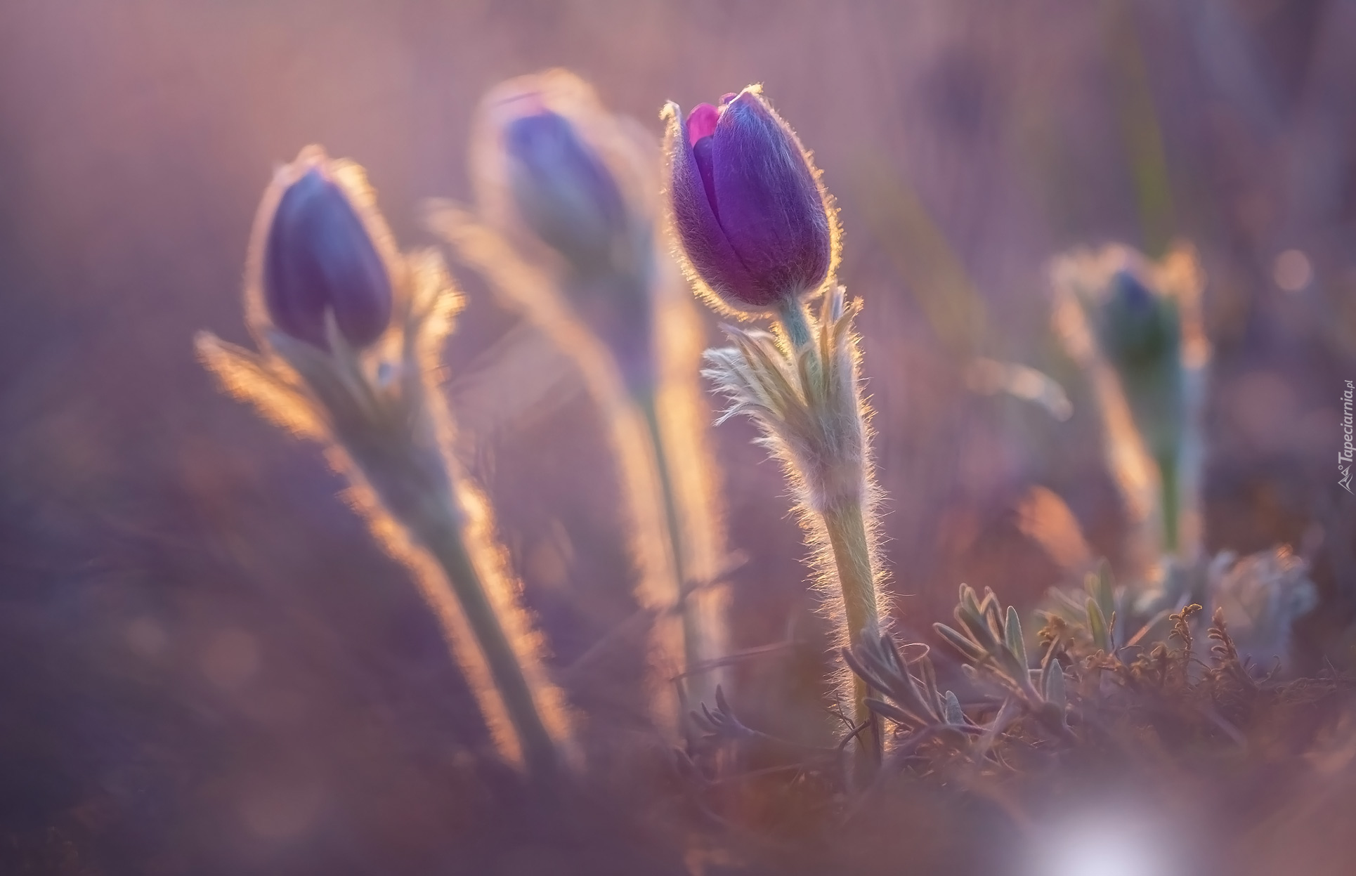 Edytor tapety: Pąki fioletowych sasanek w rozmyciu