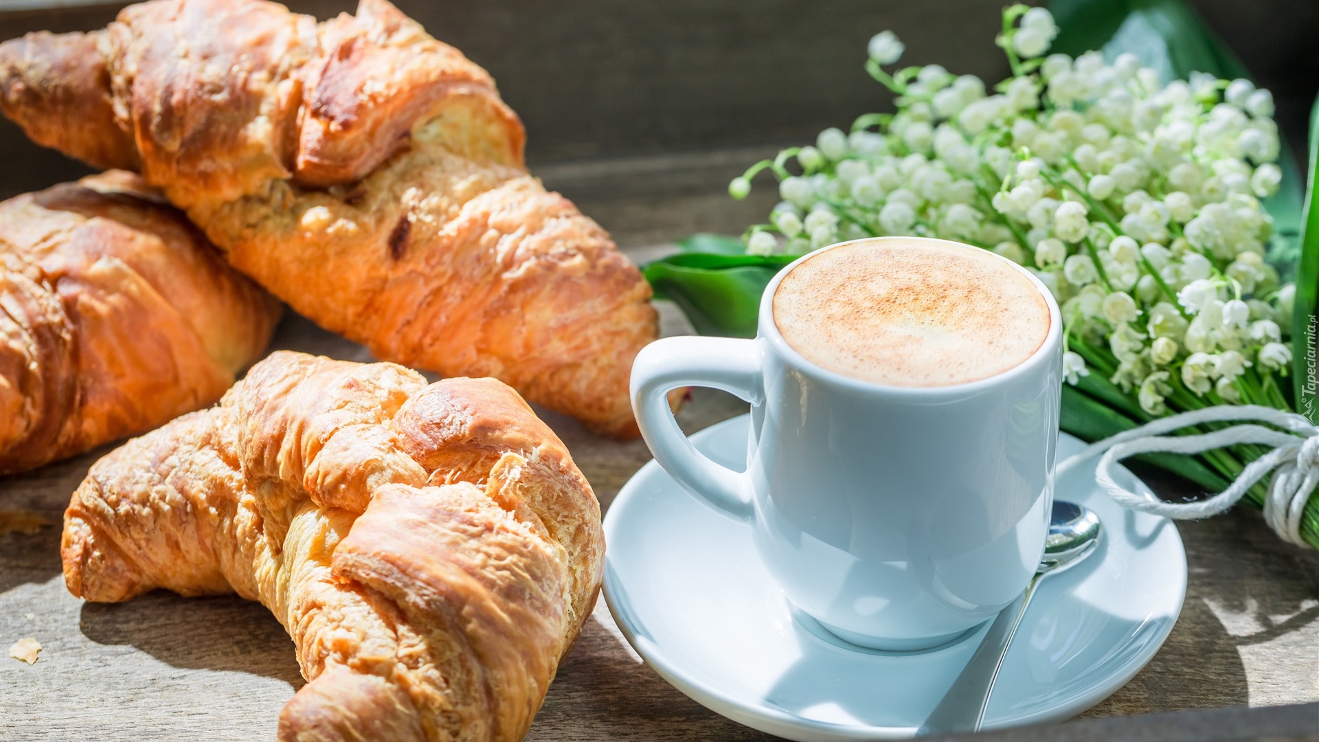 Edytor tapety: Rogaliki i kawa w filiżance obok konwalii