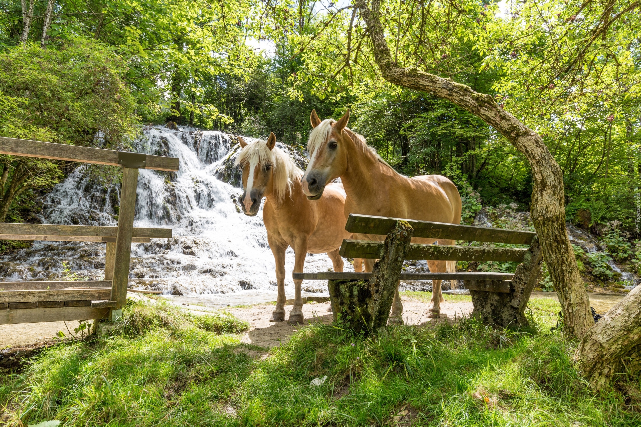 Edytor tapety: Dwa konie przy ławce obok wodospadu
