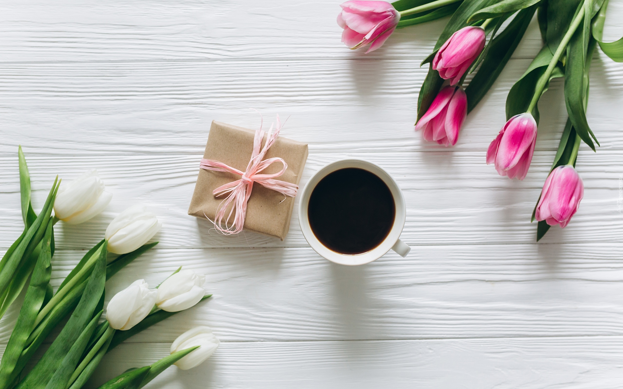 Edytor tapety: Prezent i kawa pośród tulipanów