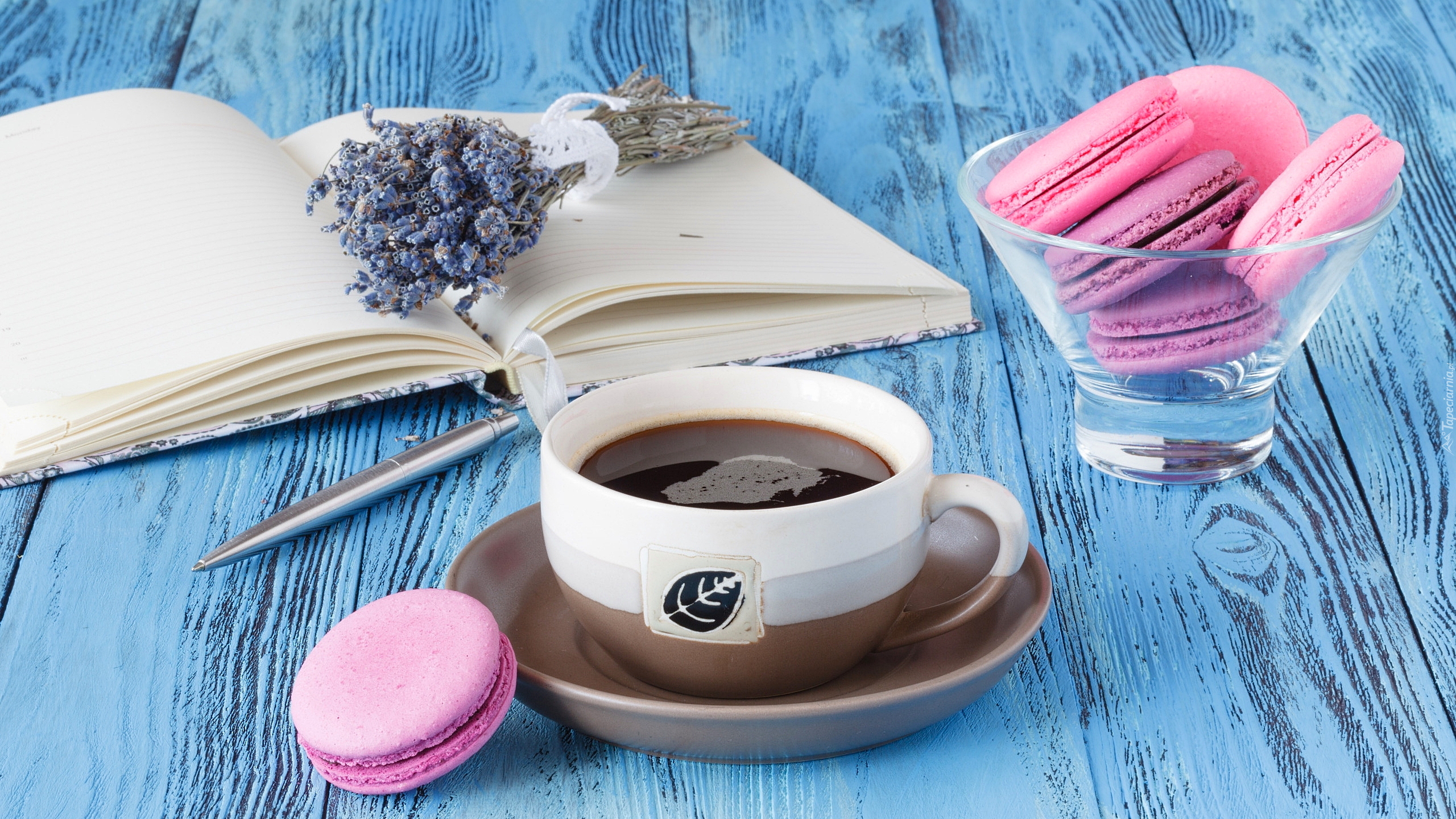 Edytor tapety: Bukiecik lawendy na notatniku obok kawy i makaroników