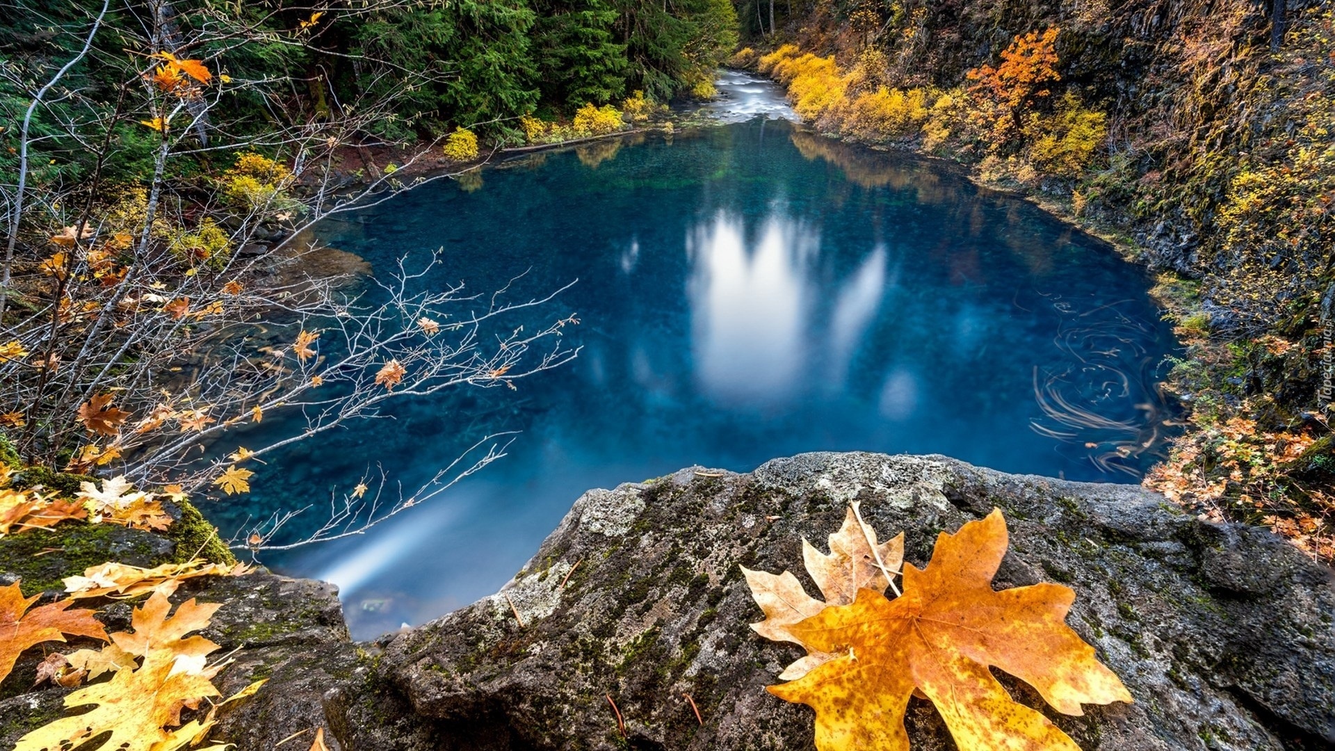Edytor tapety: Jesienne liście na skałach nad jeziorem