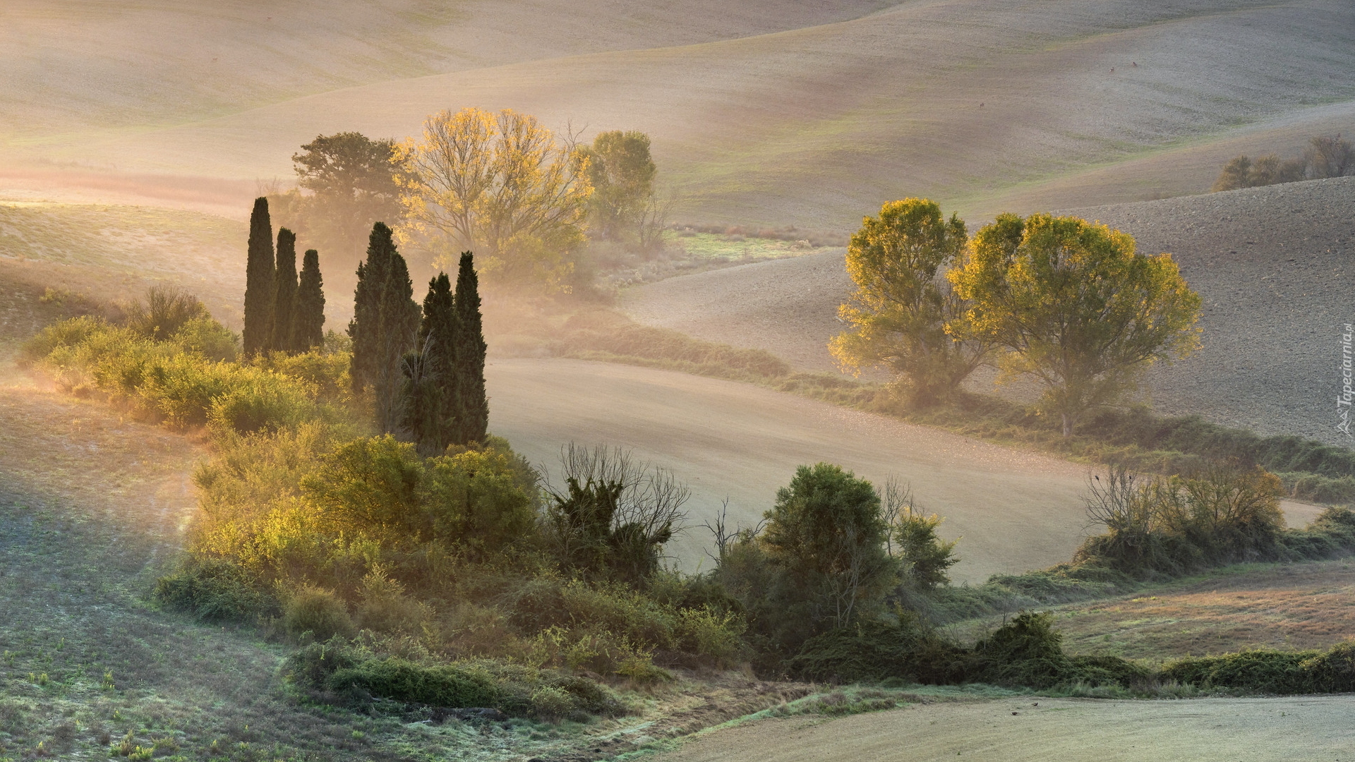 Edytor tapety: Drzewa na zamglonych wzgórzach Toskanii
