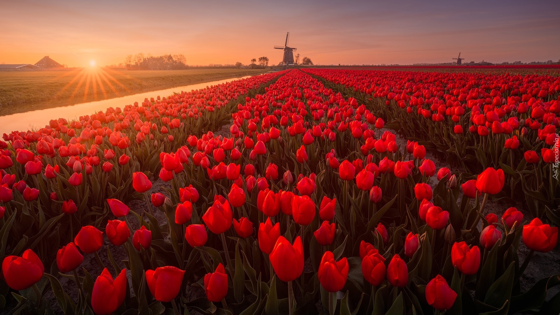 Edytor tapety: Wiatraki na plantacji czerwonych tulipanów