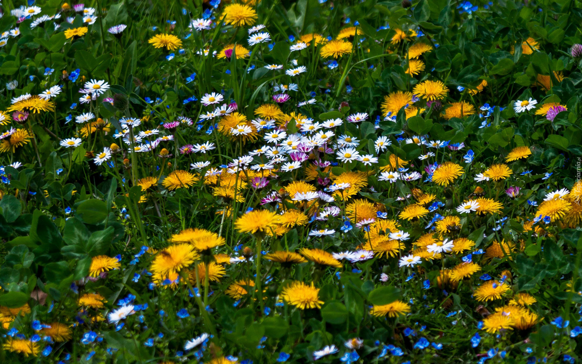Edytor tapety: Stokrotki i mniszki lekarskie w trawie