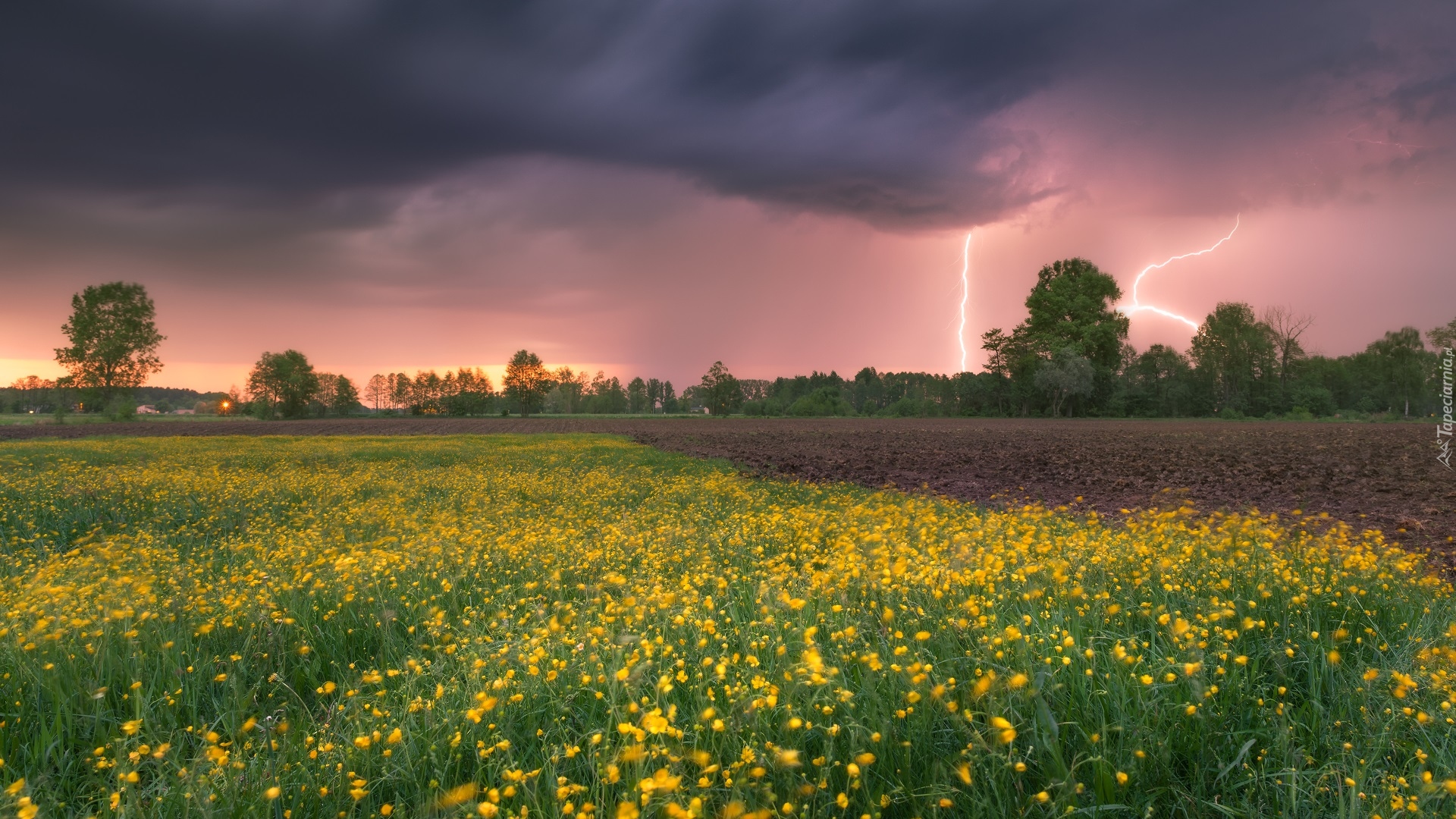 Edytor tapety: Widok z łąki na pioruny nad drzewami