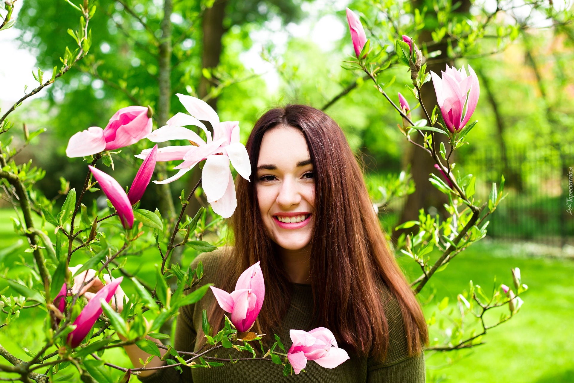 Edytor tapety: Dziewczyna przy kwitnących magnoliach