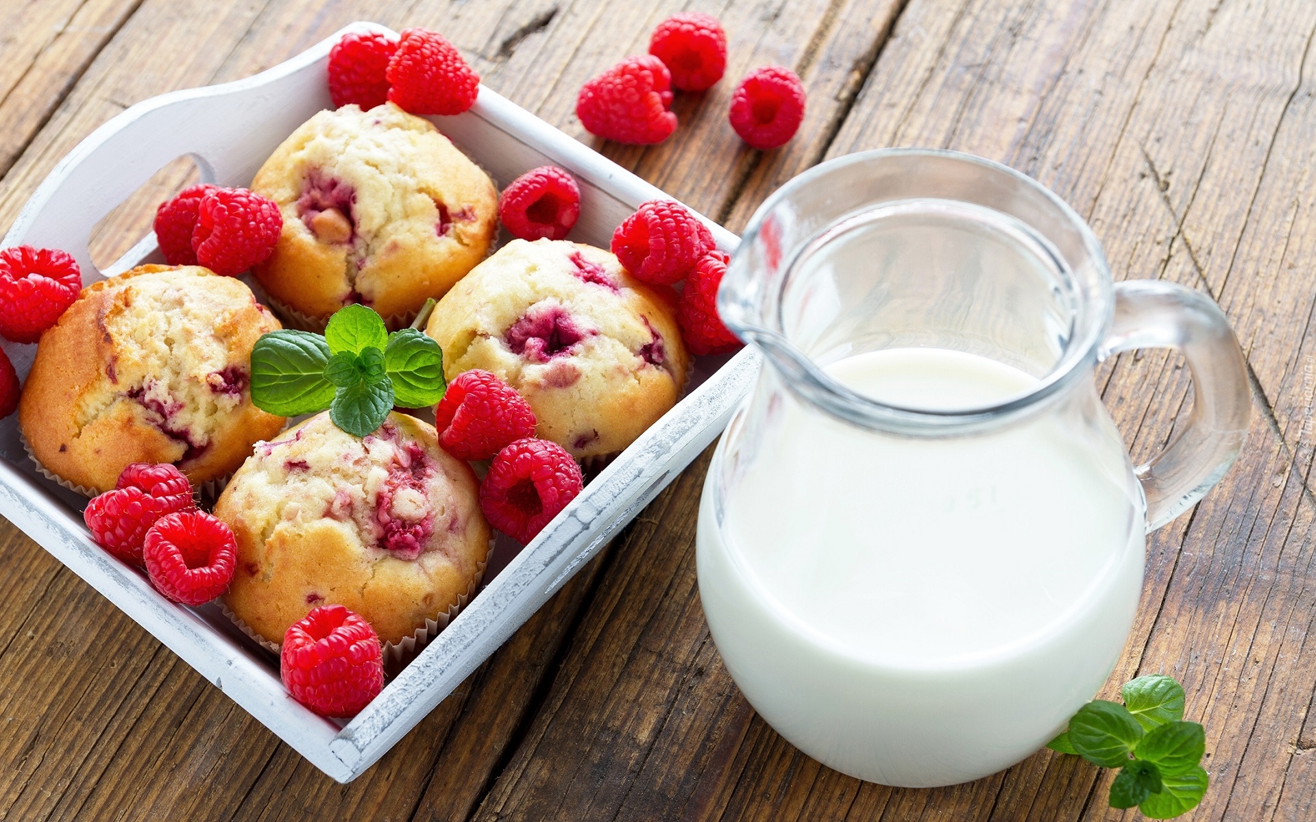 Edytor tapety: Cztery babeczki obok mleka w dzbanku