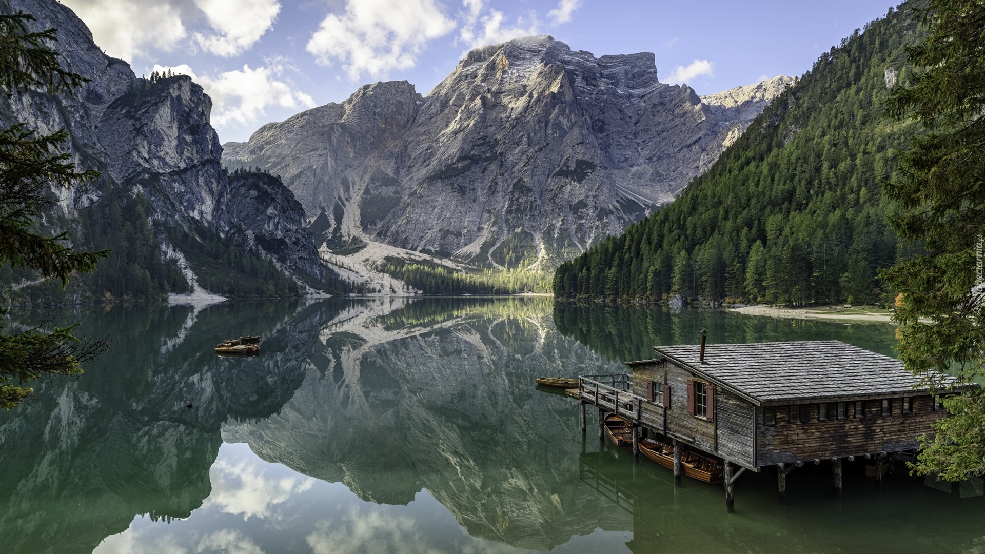 Edytor tapety: Drewniany domek na jeziorze Pragser Wildsee