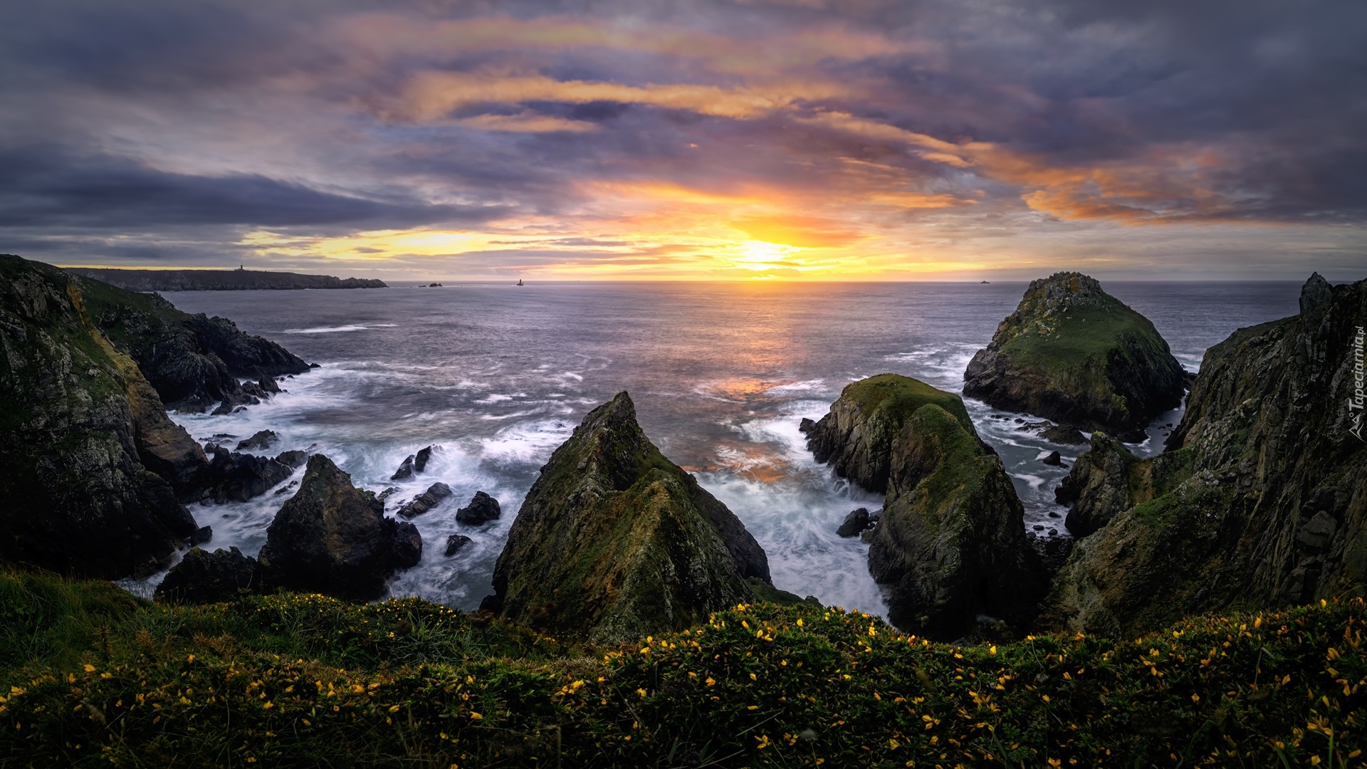 Edytor tapety: Widok na skały i wschód słońca nad morzem