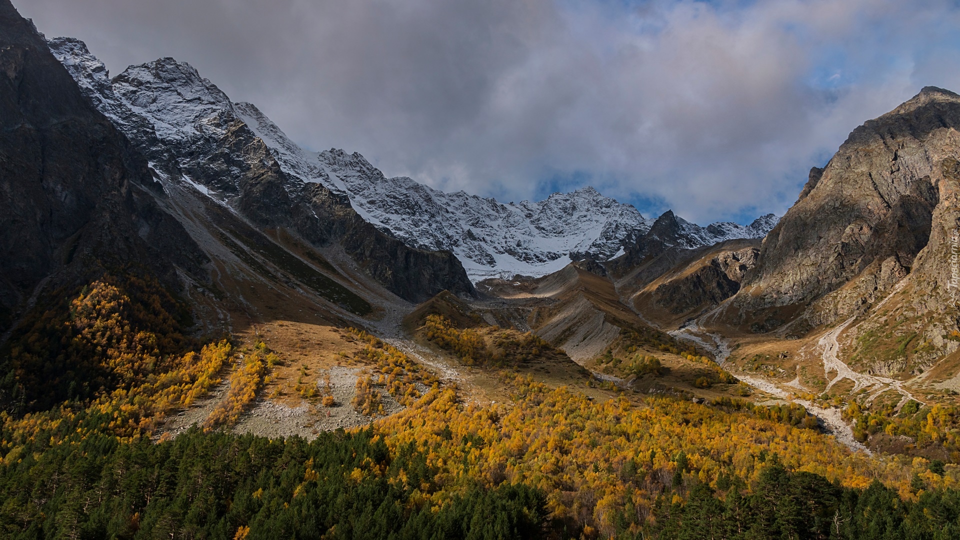 Edytor tapety: Widok na dolinę i ośnieżone szczyty
