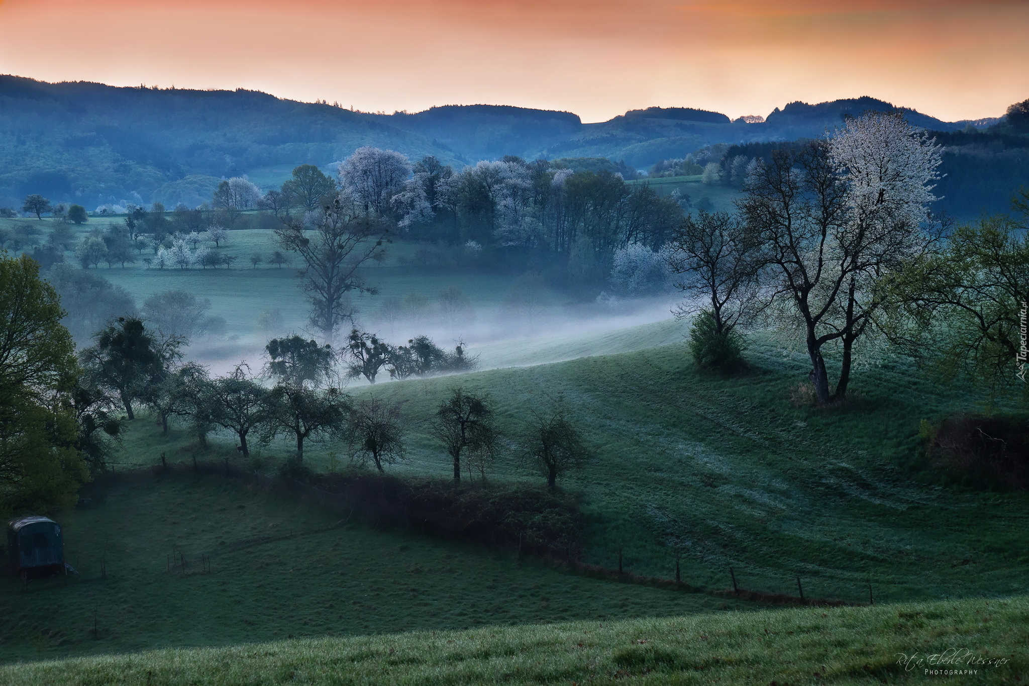 Edytor tapety: Drzewa na wzgórzach w porannej mgle
