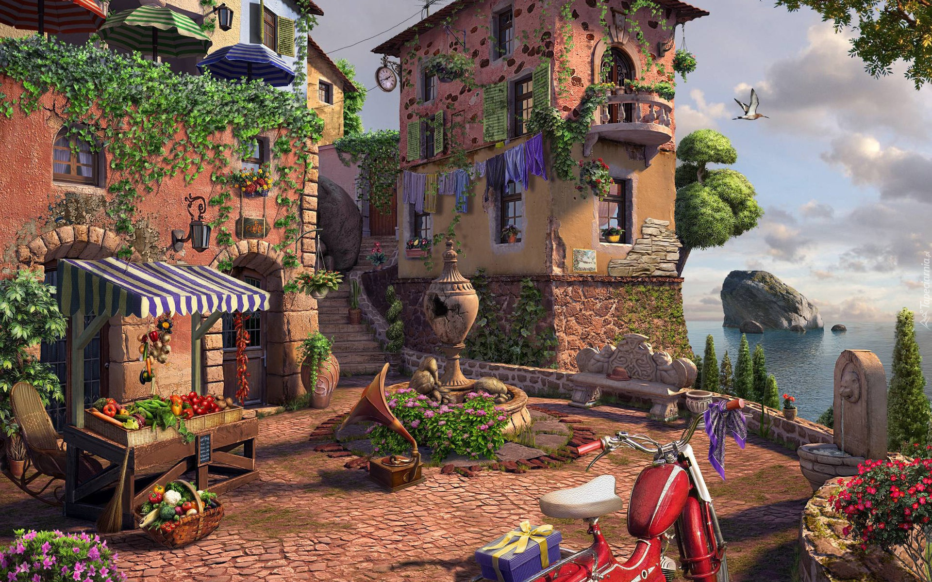 Edytor tapety: Stragan obok domu i fontanny