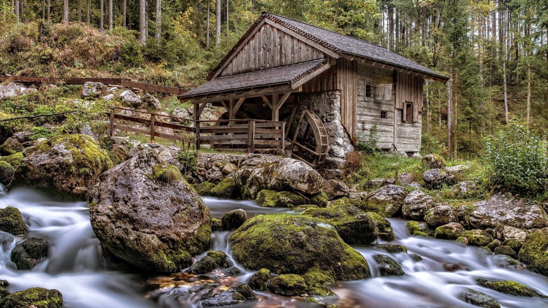 Edytor tapety: Drewniany młyn wodny przy leśnej rzece
