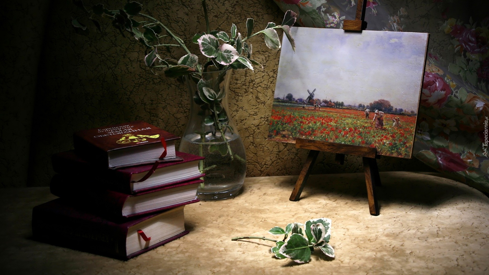 Edytor tapety: Obraz na sztaludze obok książek i wazonu