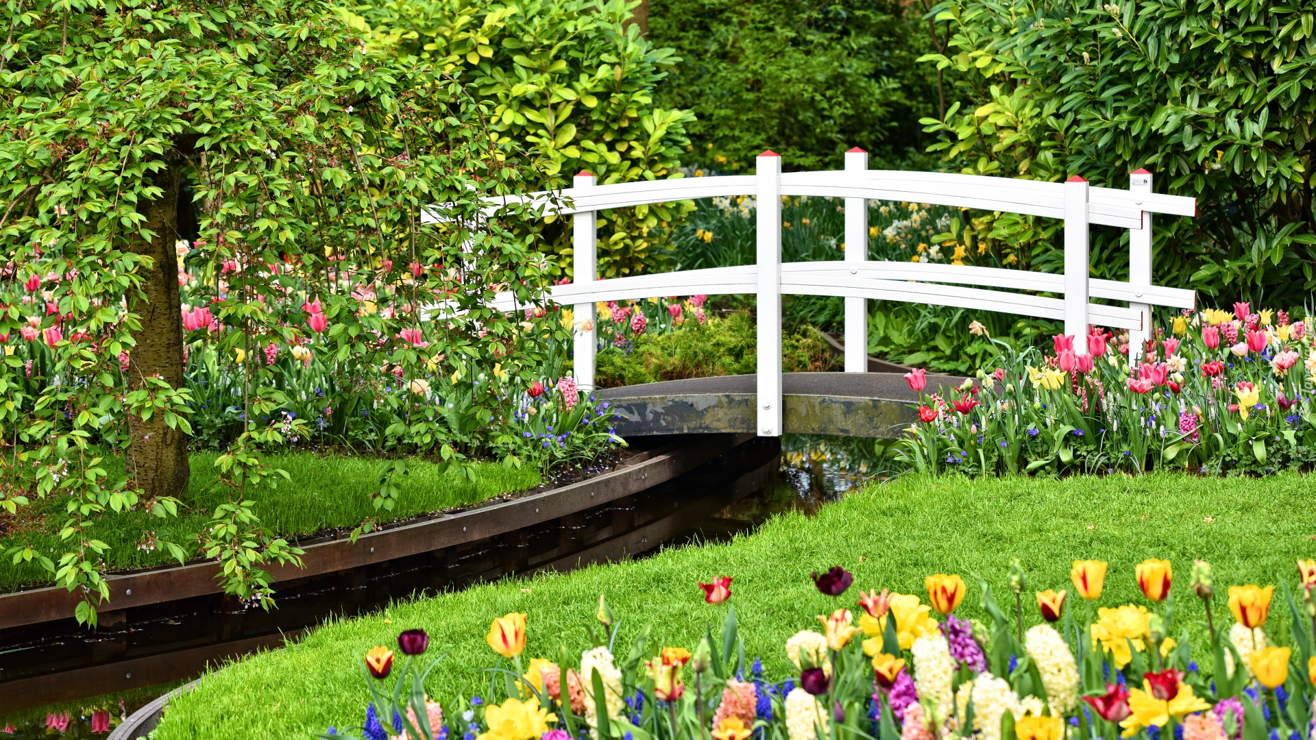 Edytor tapety: Tulipany obok białego mostku nad strumieniem w parku