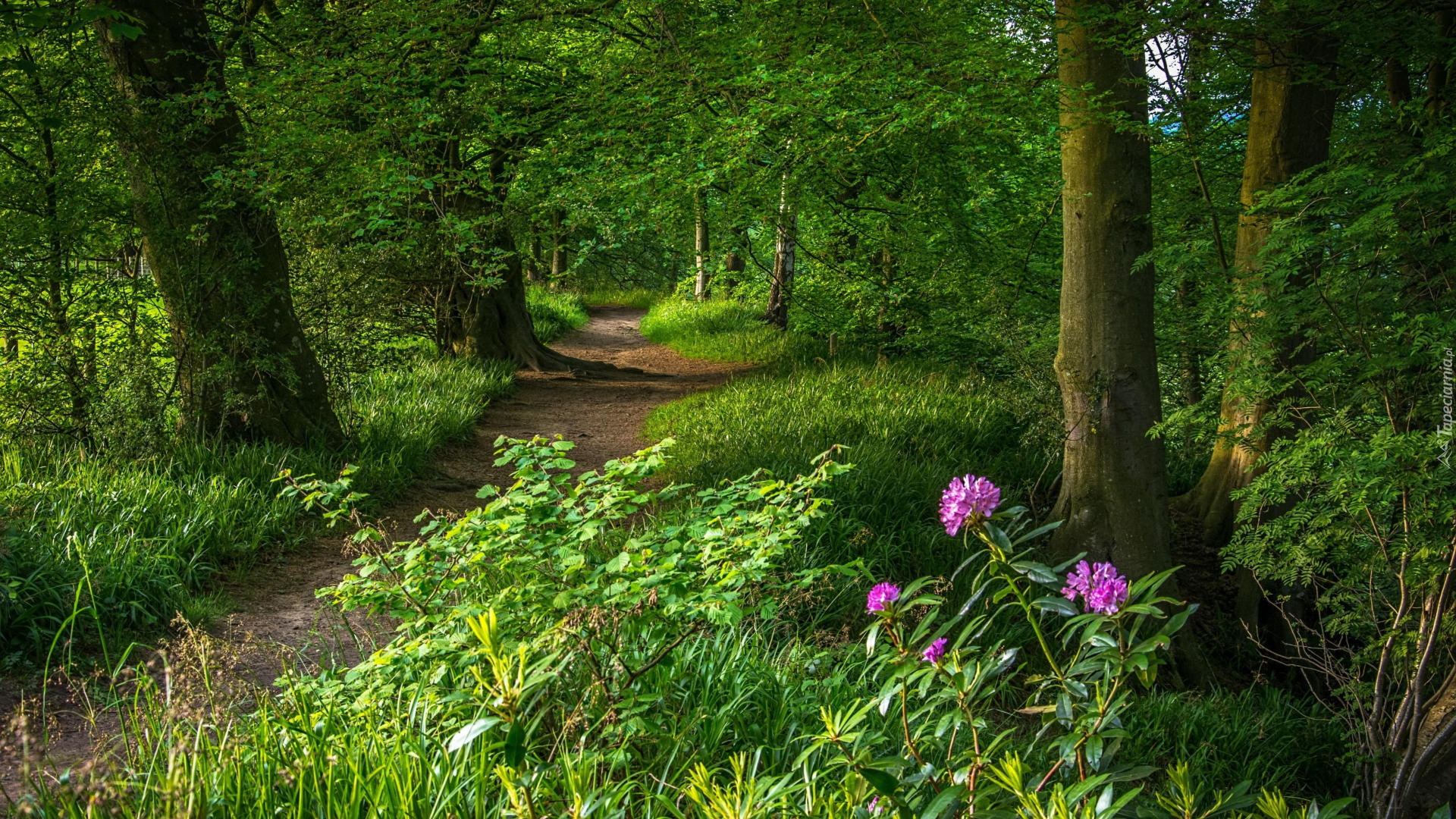 Edytor tapety: Różanecznik pod drzewami obok ścieżki