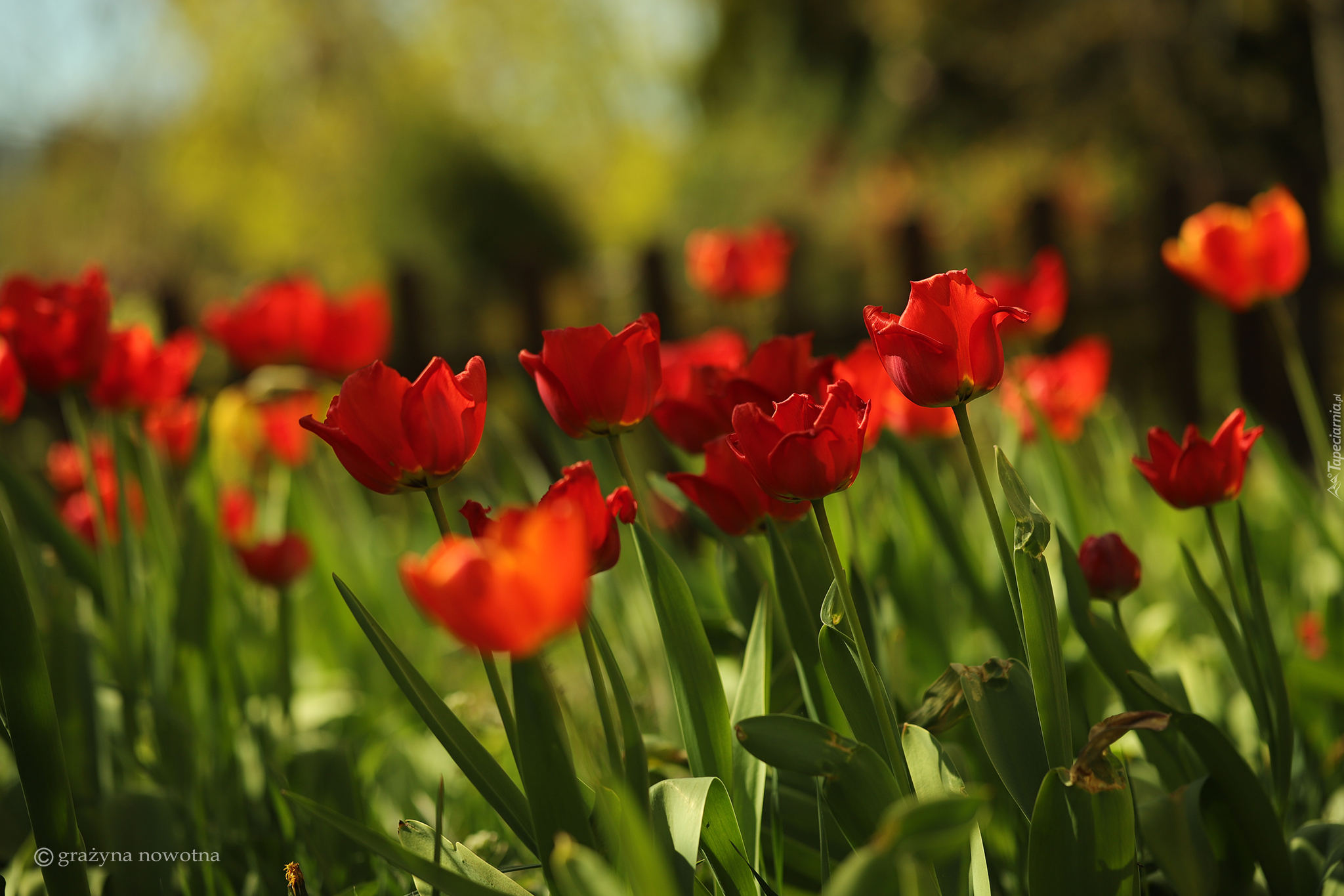 Edytor tapety: Rozkwitnięte czerwone tulipany na rozmytym tle