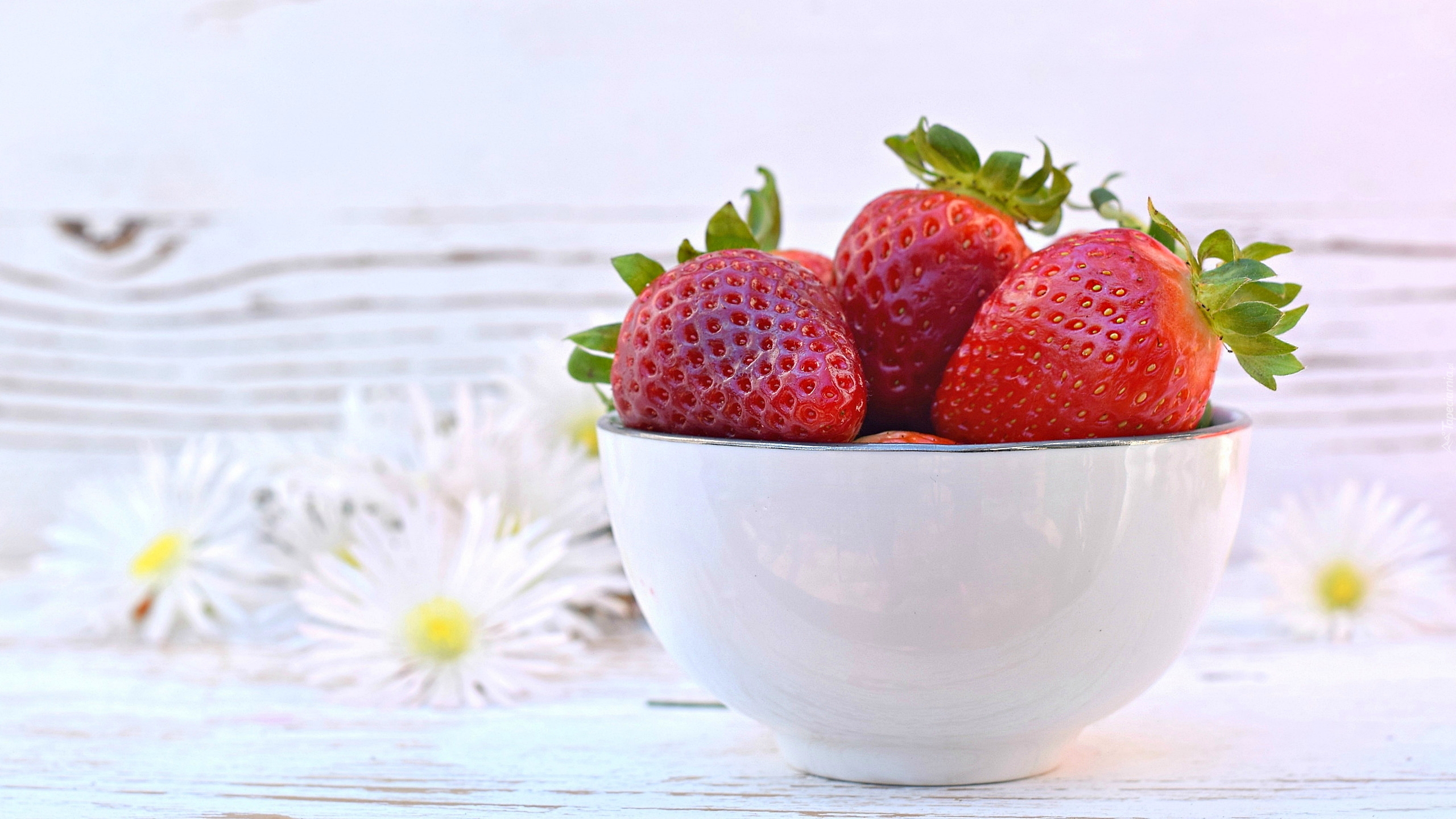 Edytor tapety: Truskawki w miseczce na rozmytym tle