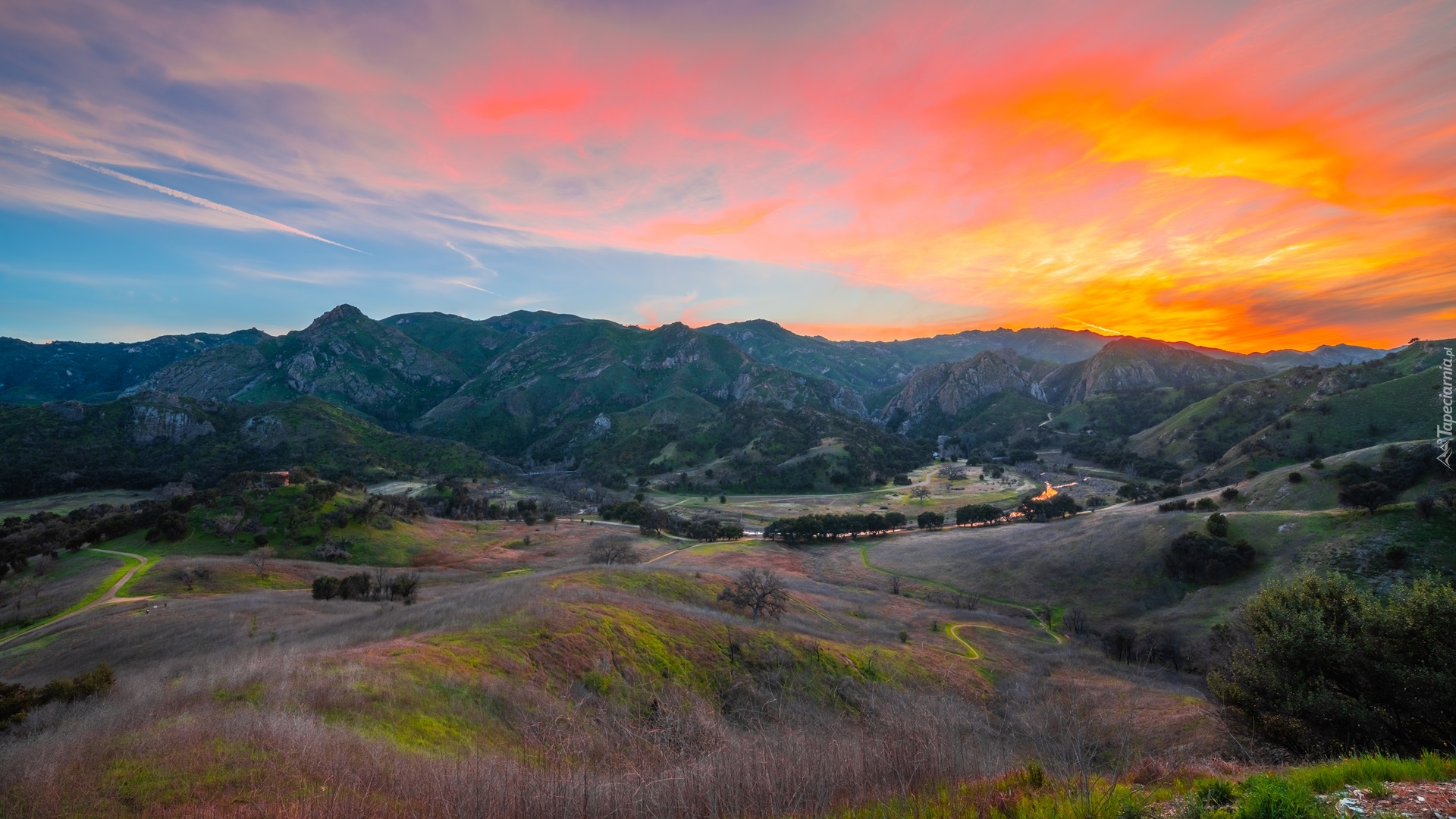 Edytor tapety: Kolorowy zachód słońca nad górami