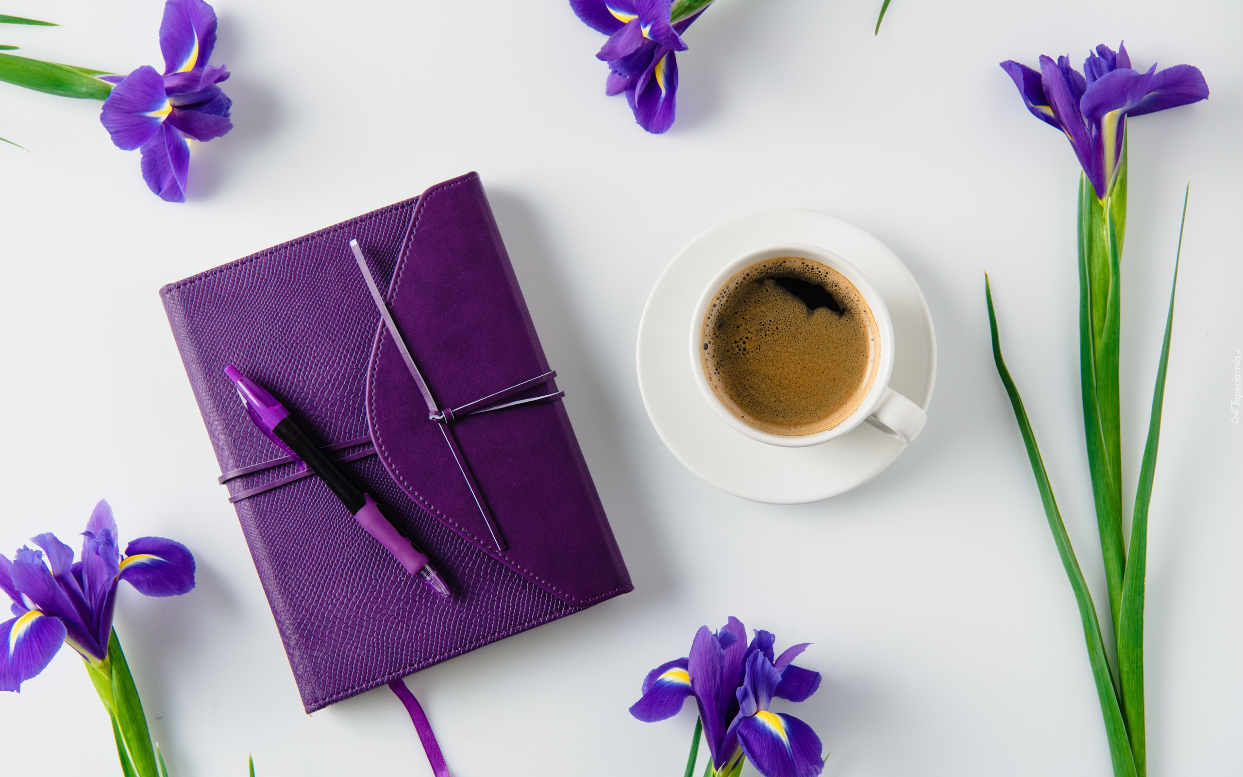 Edytor tapety: Kawa obok notesu z długopisem i irysów