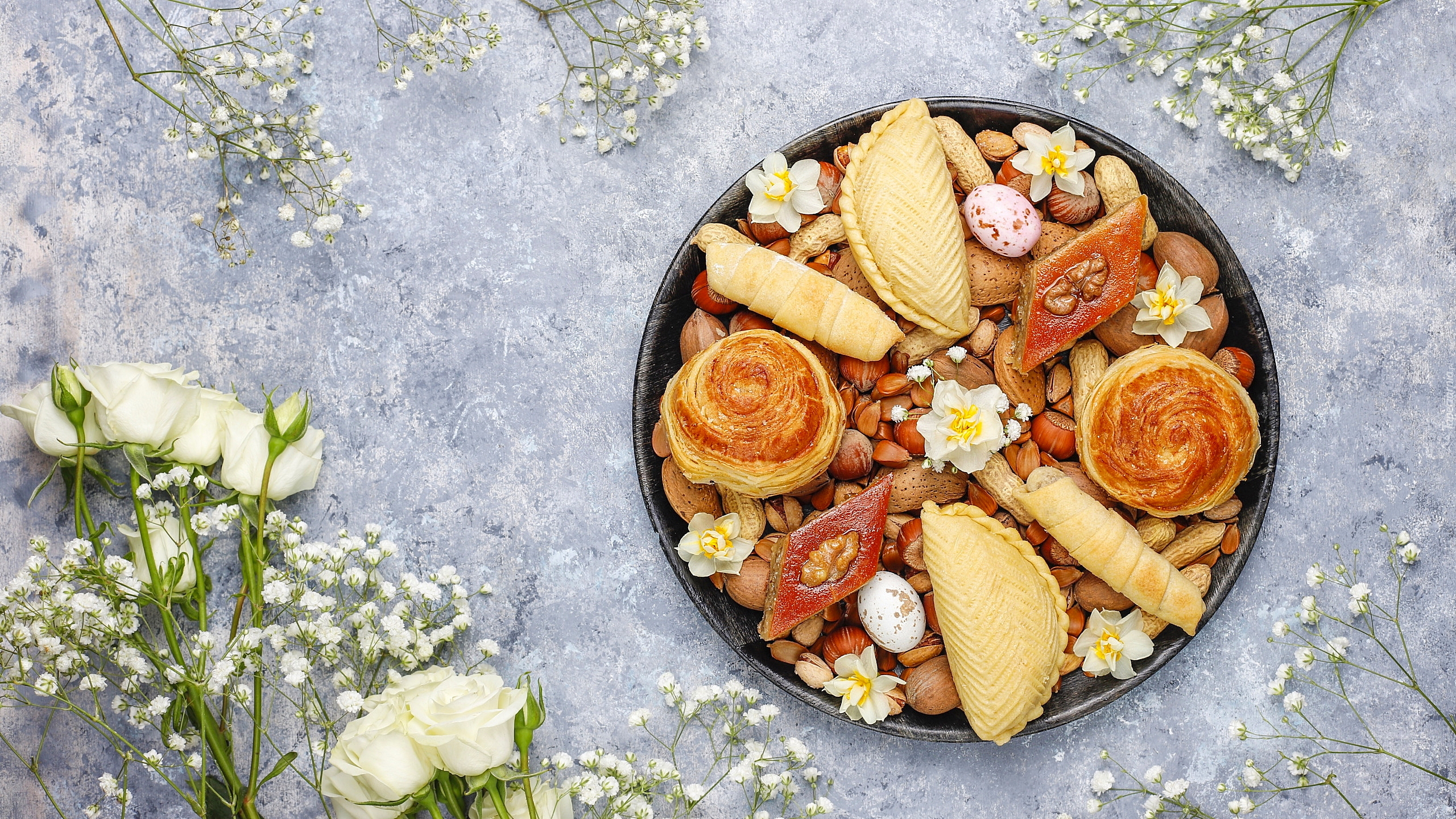 Edytor tapety: Białe kwiaty obok ciasteczek w miseczce