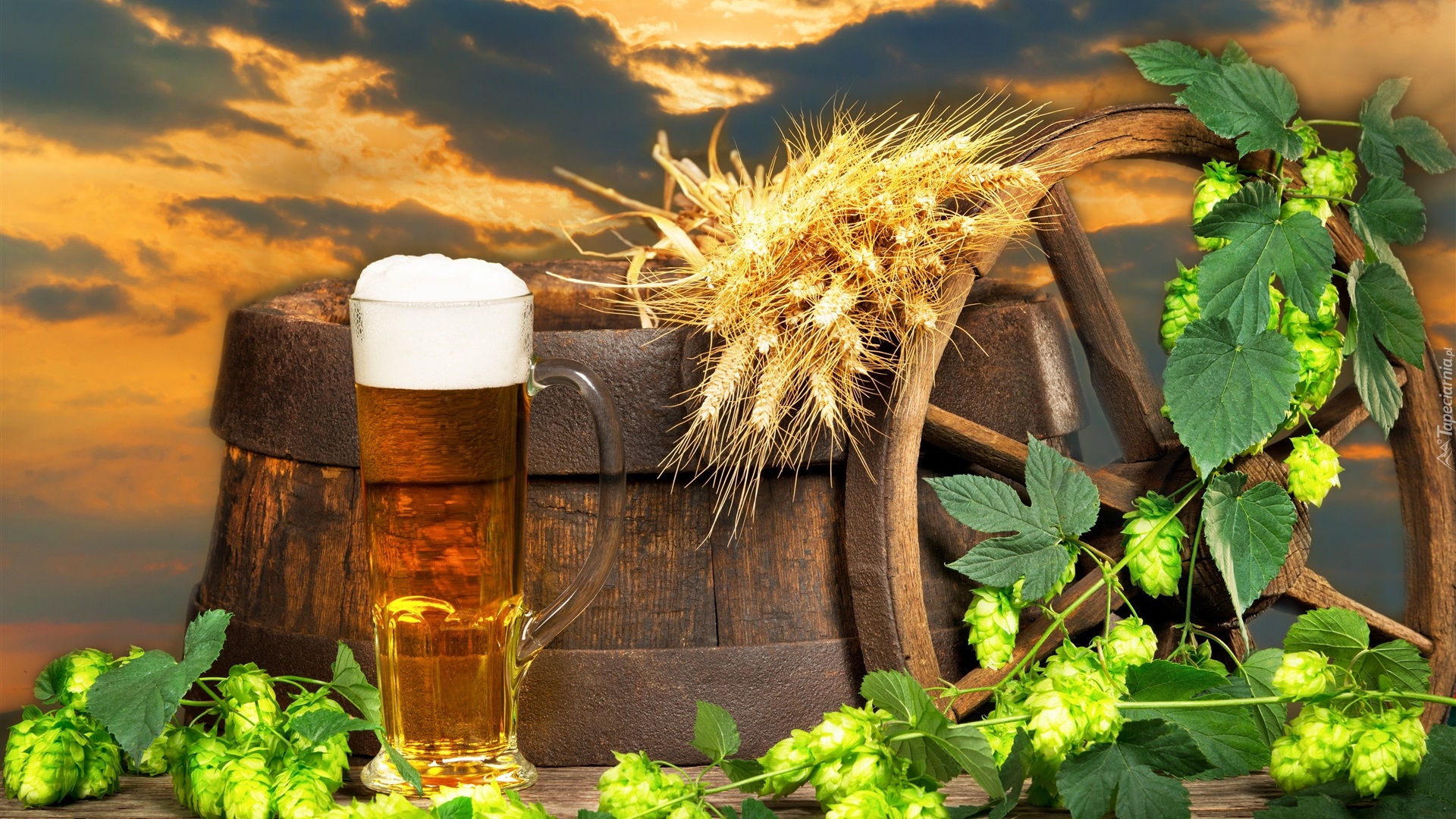 Edytor tapety: Kufel piwa obok beczki i gałązek chmielu