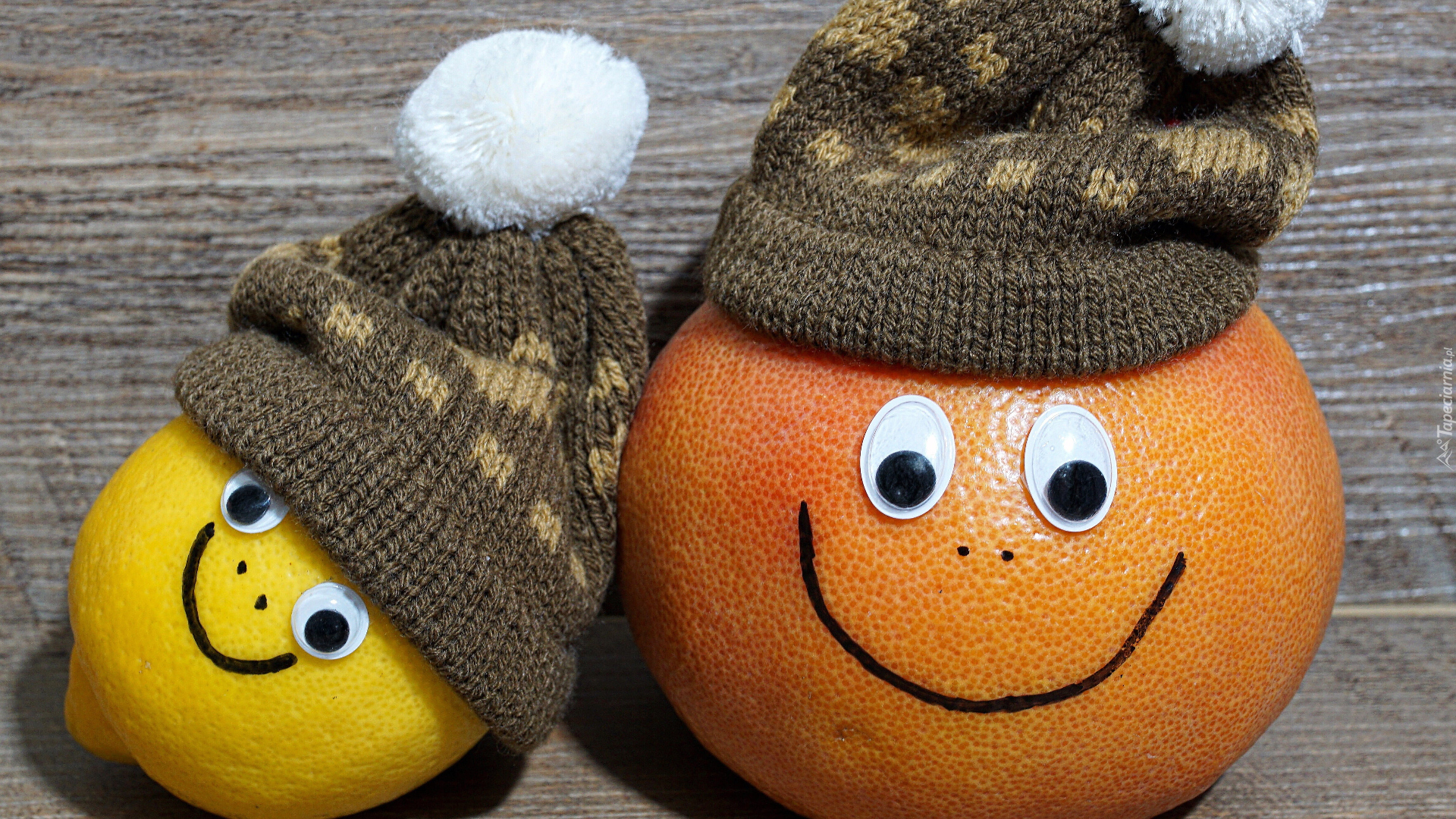 Edytor tapety: Uśmiechnięta cytryna i pomarańcza w czapeczkach