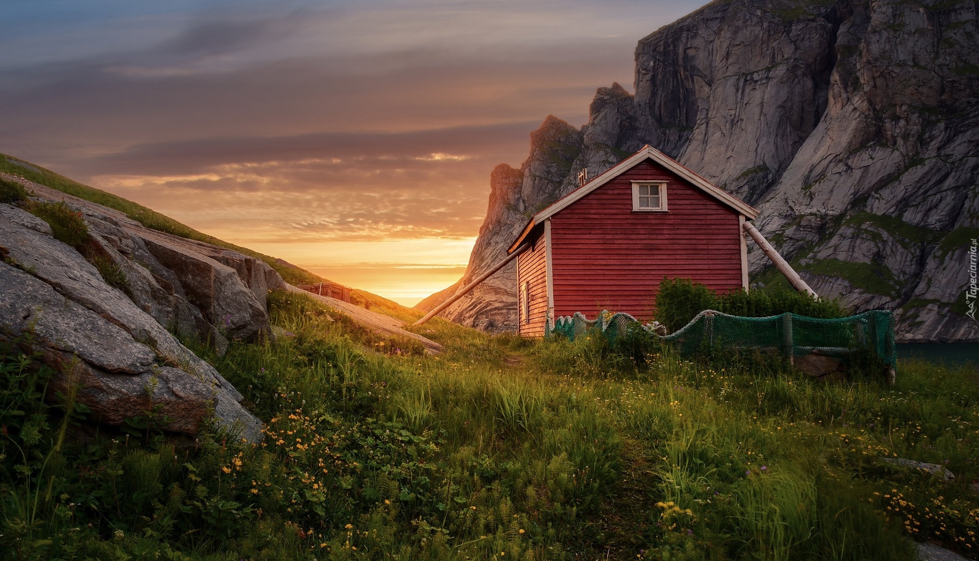 Edytor tapety: Czerwony domek na tle gór