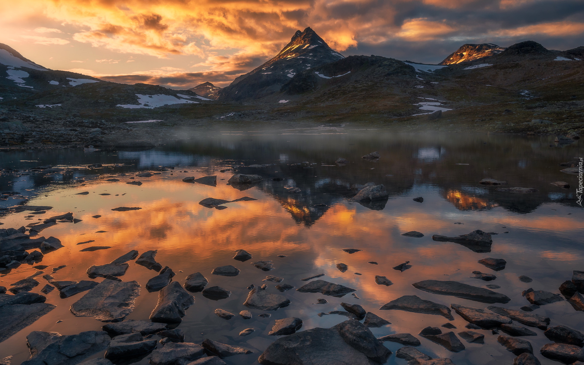 Edytor tapety: Jezioro w górach Jotunheimen o zachodzie słońca