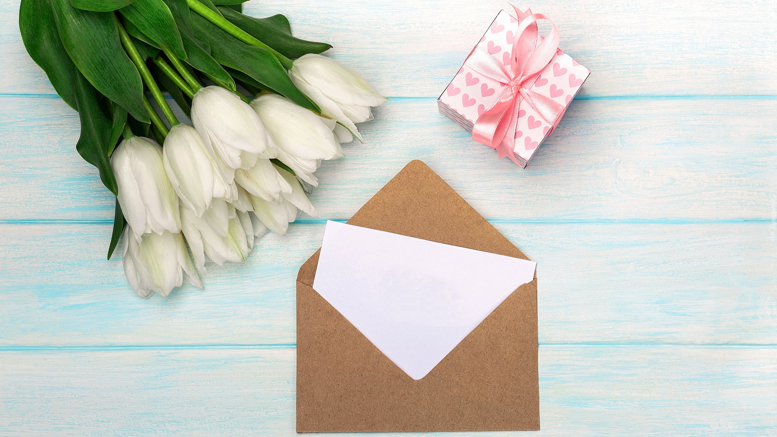 Edytor tapety: Bukiet białych tulipanów obok koperty i prezentu