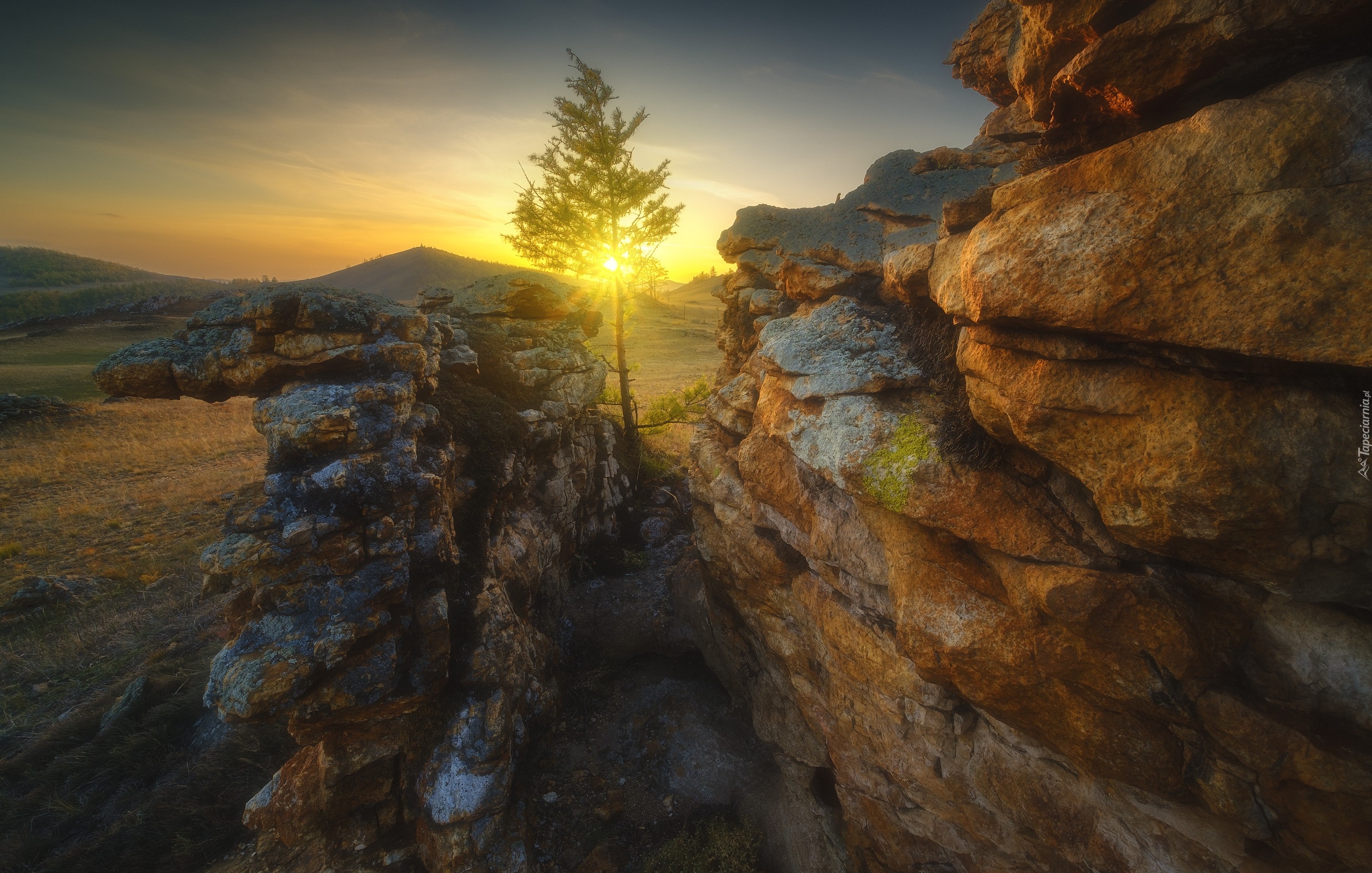 Edytor tapety: Rozświetlone drzewo pomiędzy skałami