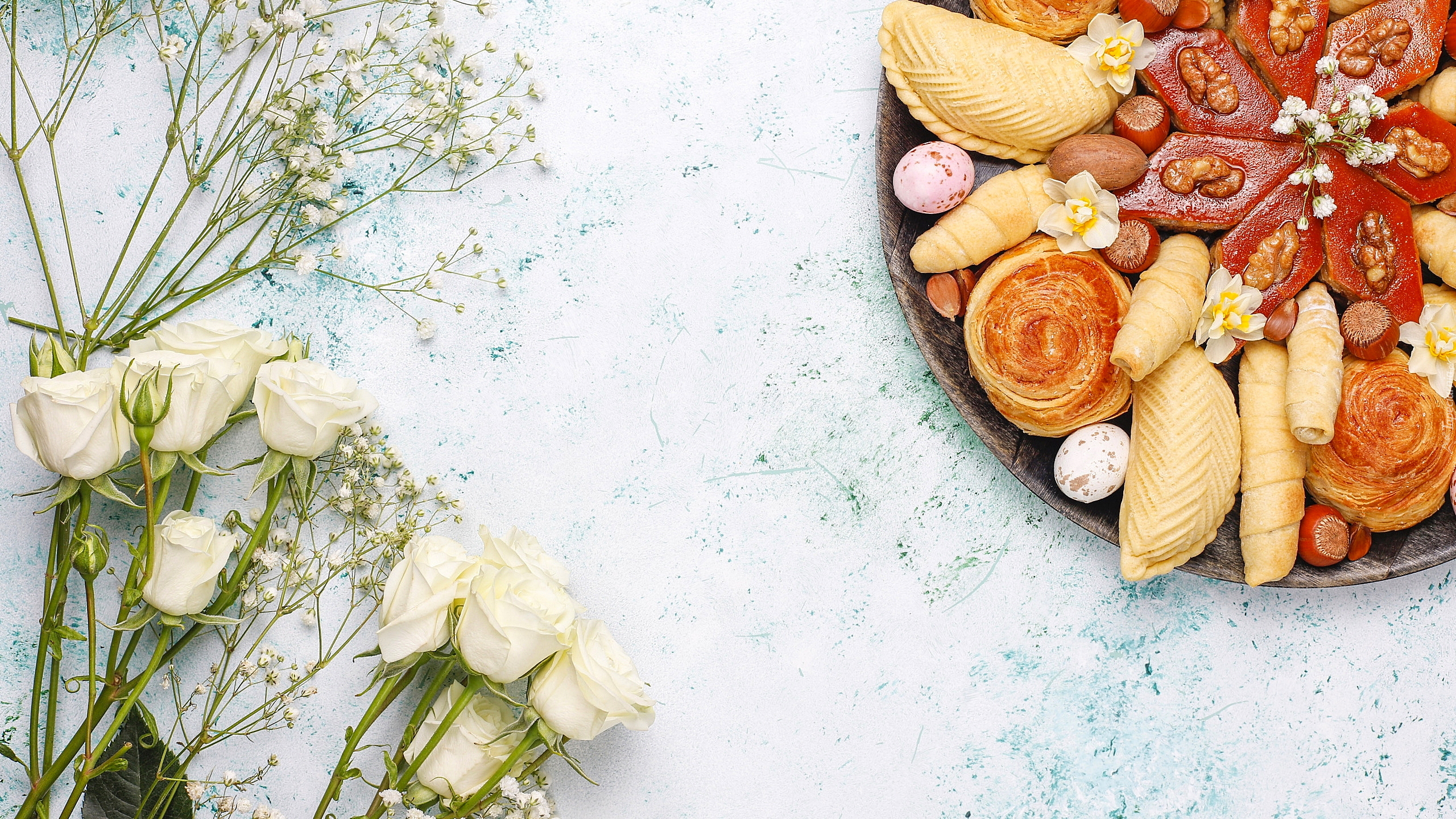 Edytor tapety: Miska ciasteczek obok róż i gipsówek