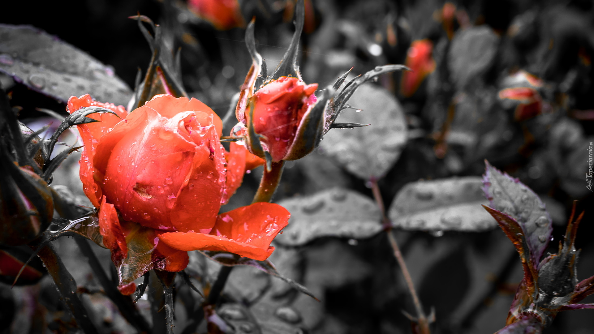 Edytor tapety: Mokra czerwona róża z pąkiem