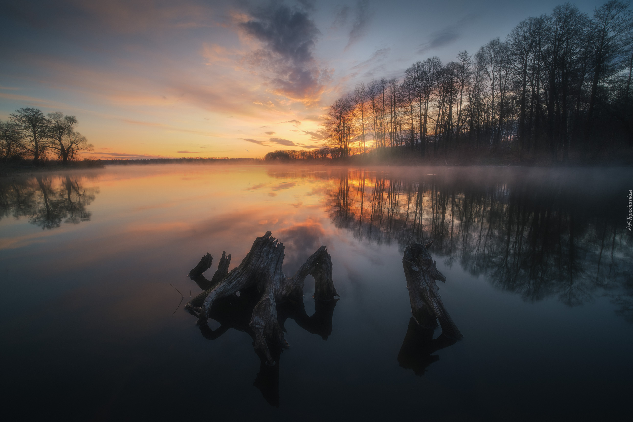 Edytor tapety: Drzewa nad zamglonym o zmierzchu jeziorze