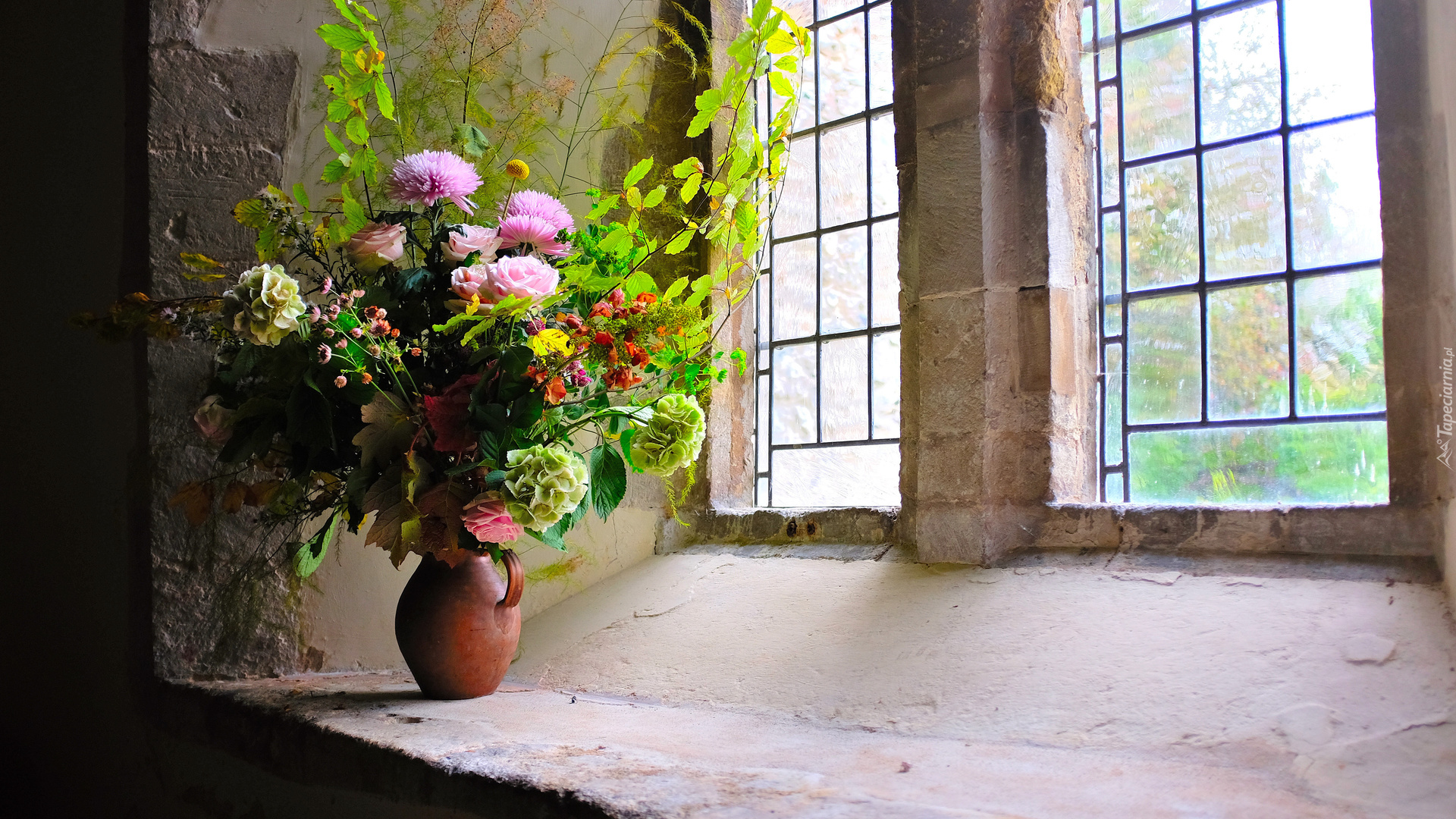 Edytor tapety: Bukiet kwiatów w dzbanku na oknie
