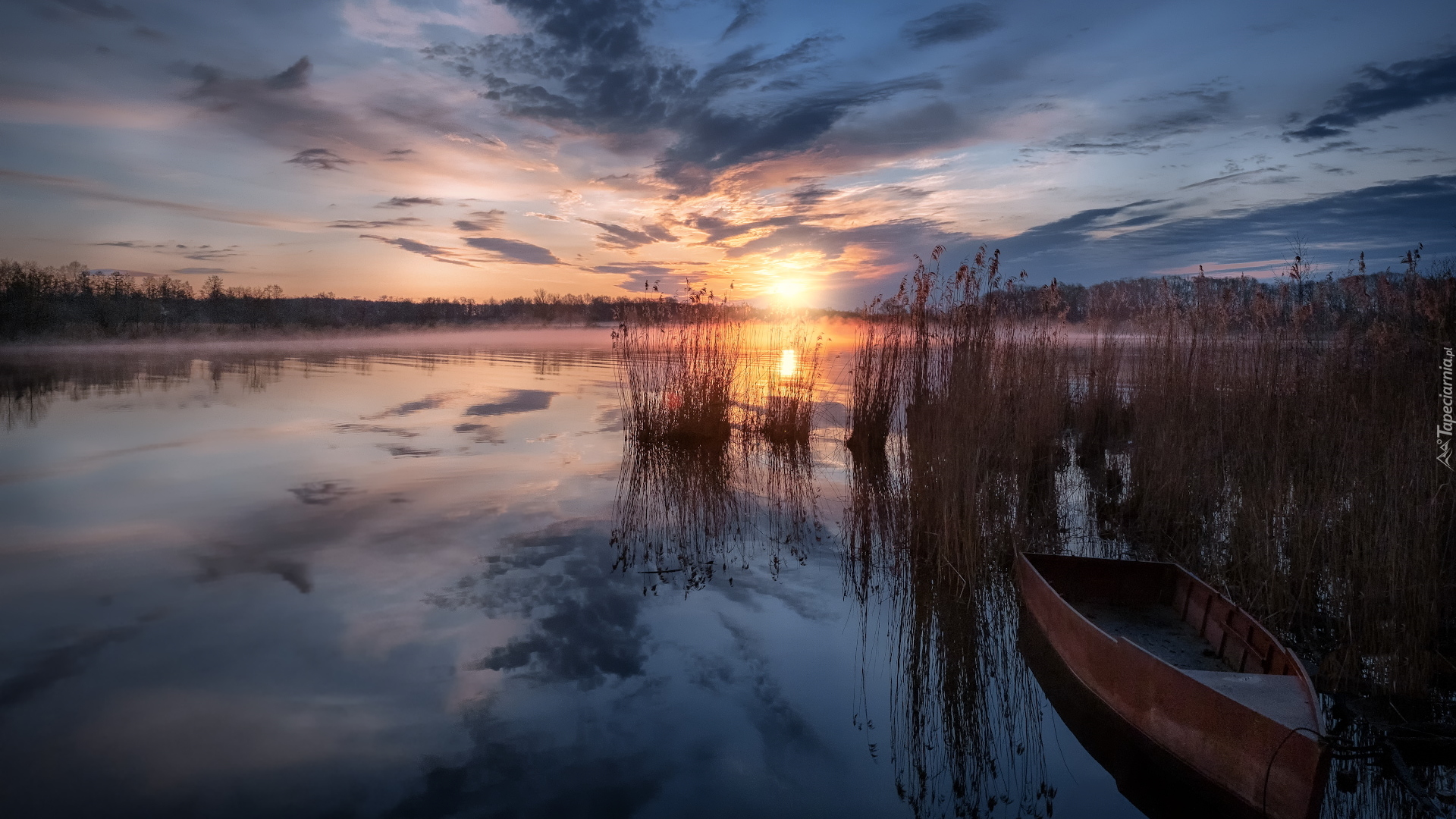 Edytor tapety: Jeziorze Szaturskie i łódka w trzcinach