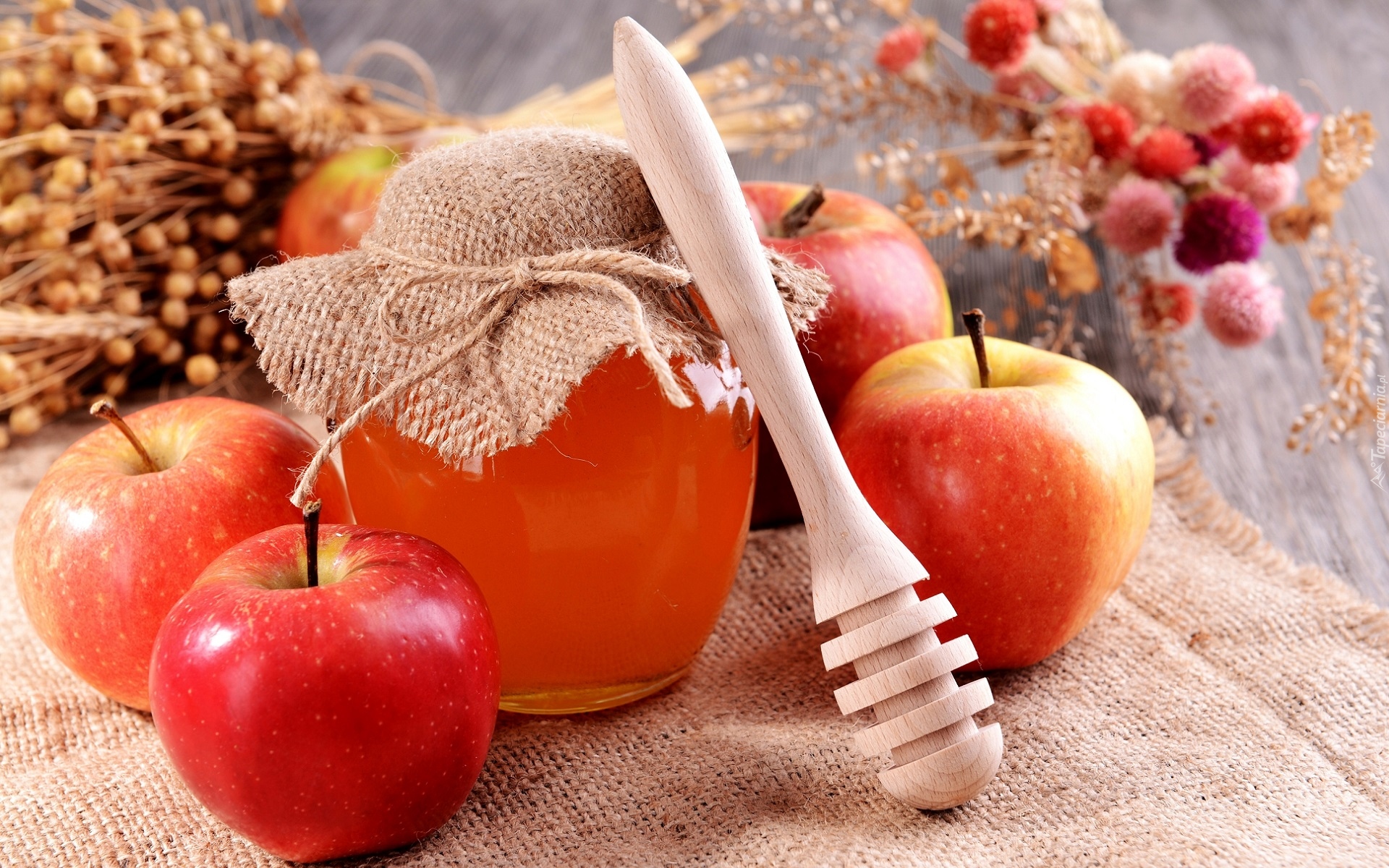 Edytor tapety: Jabłka obok słoika z dżemem