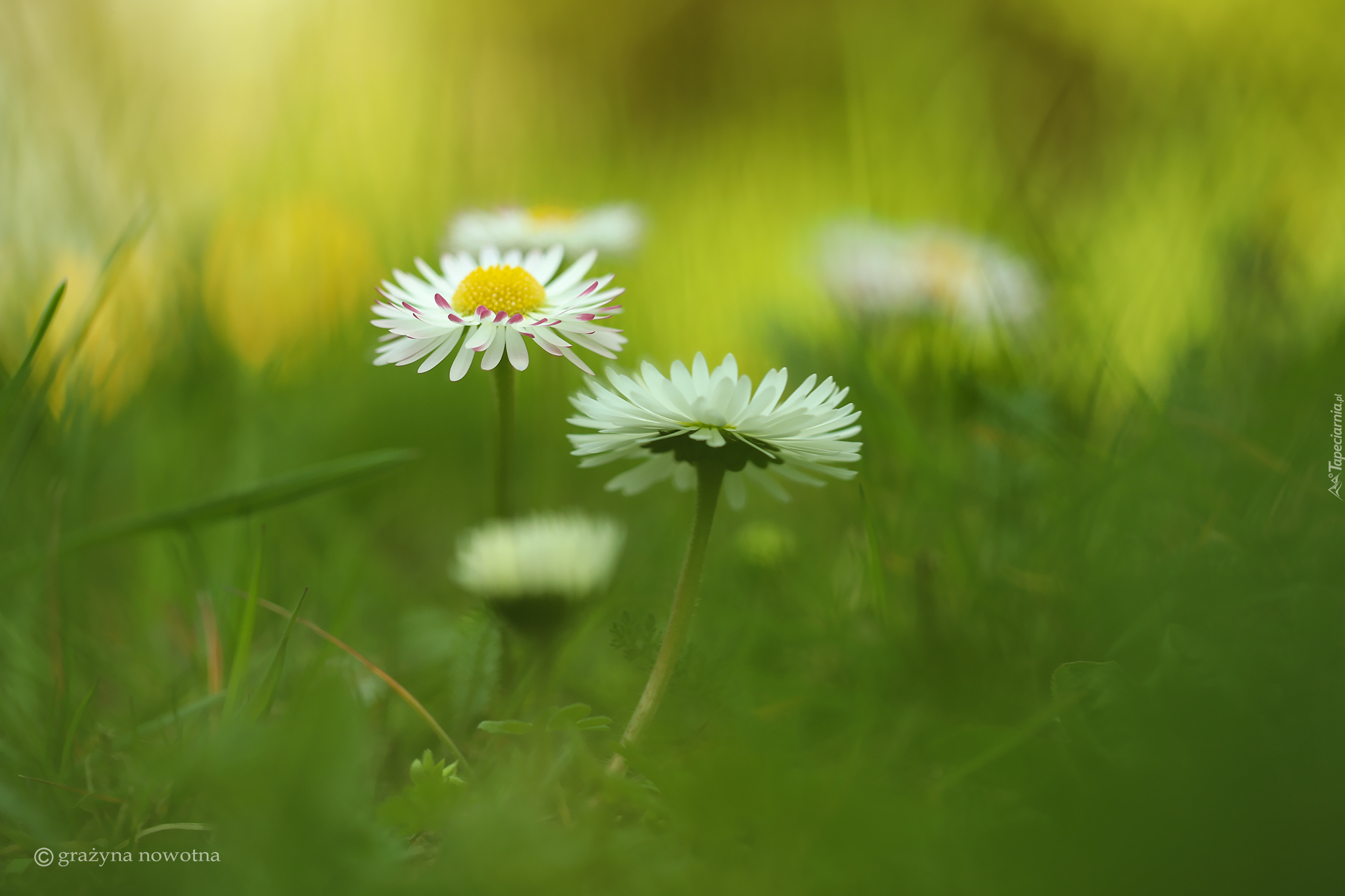 Edytor tapety: Stokrotki w trawie na rozmytym tle