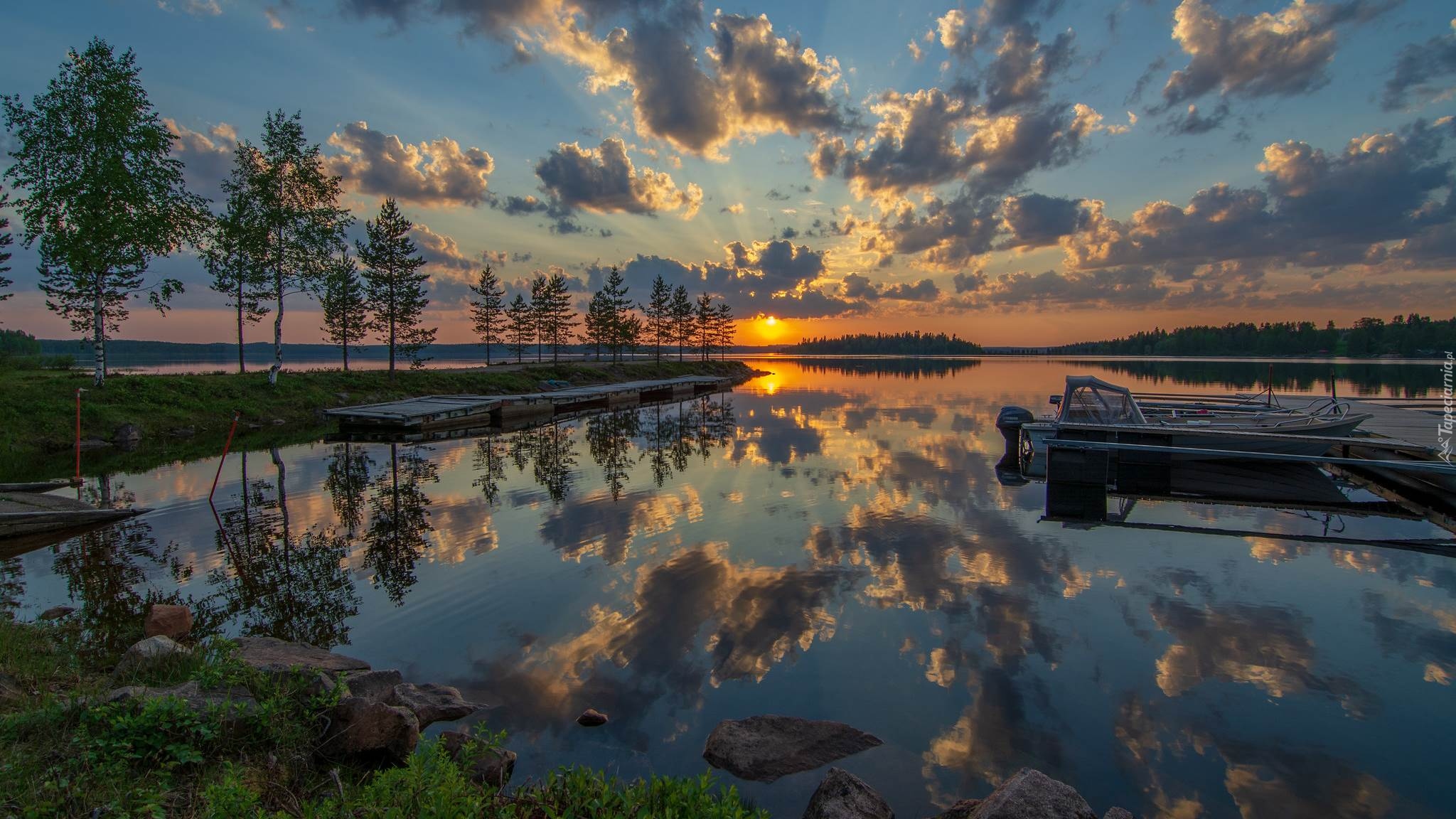 Edytor tapety: Drzewa i pomosty na jeziorze o zachodzie słońca