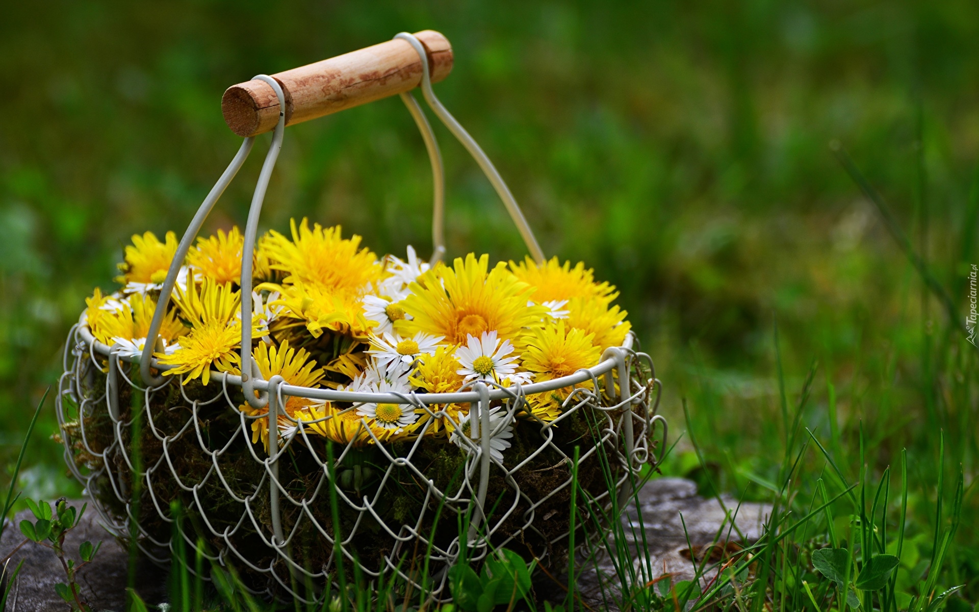 Edytor tapety: Mniszki i stokrotki w drucianym koszyku