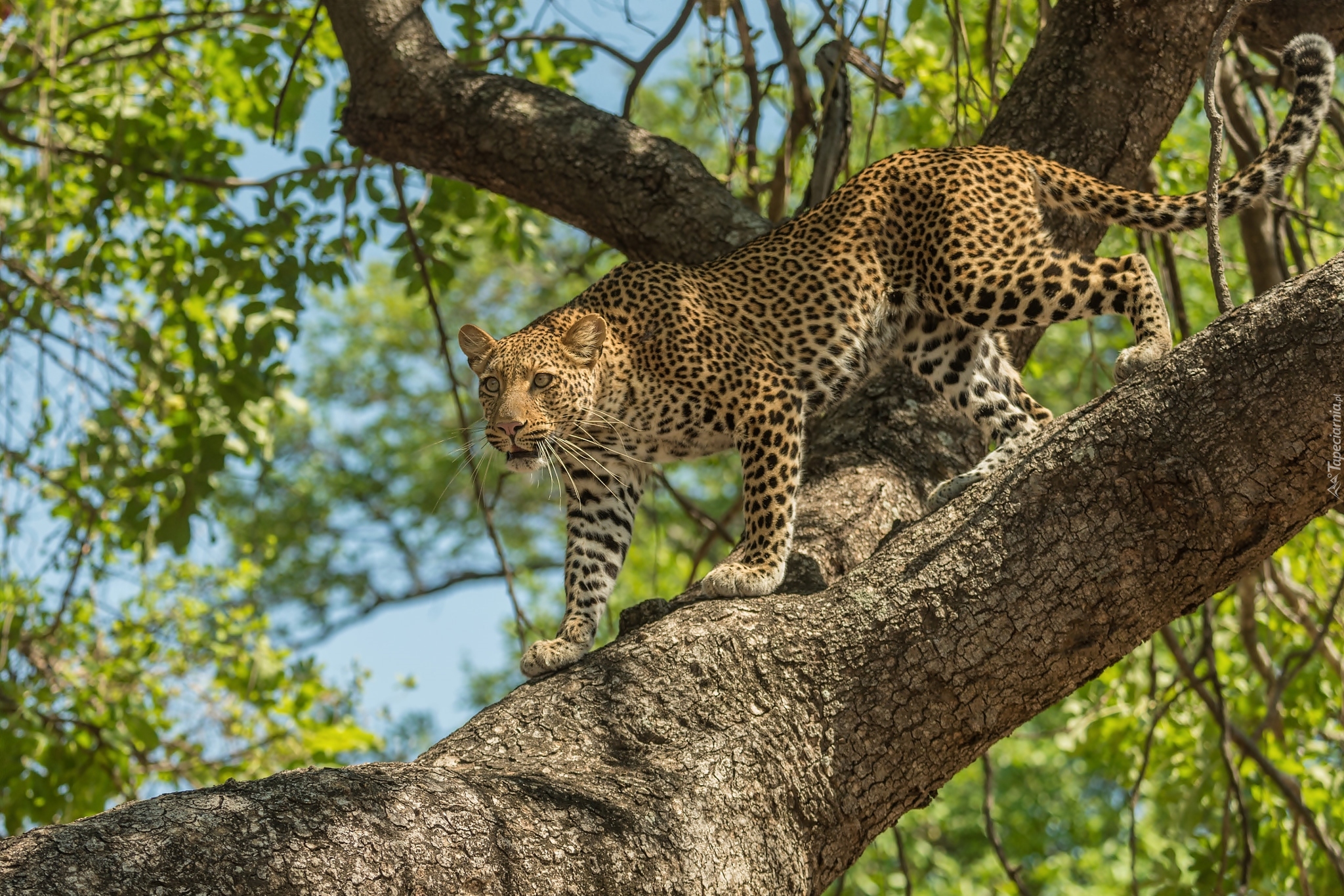 Edytor tapety: Lampart stojący na konarze drzewa